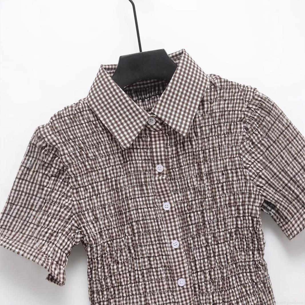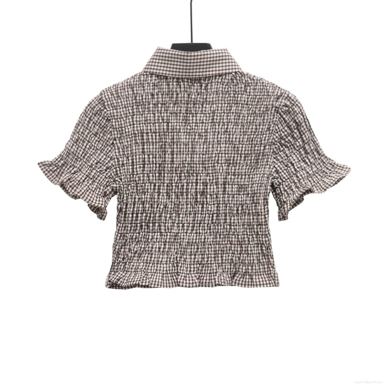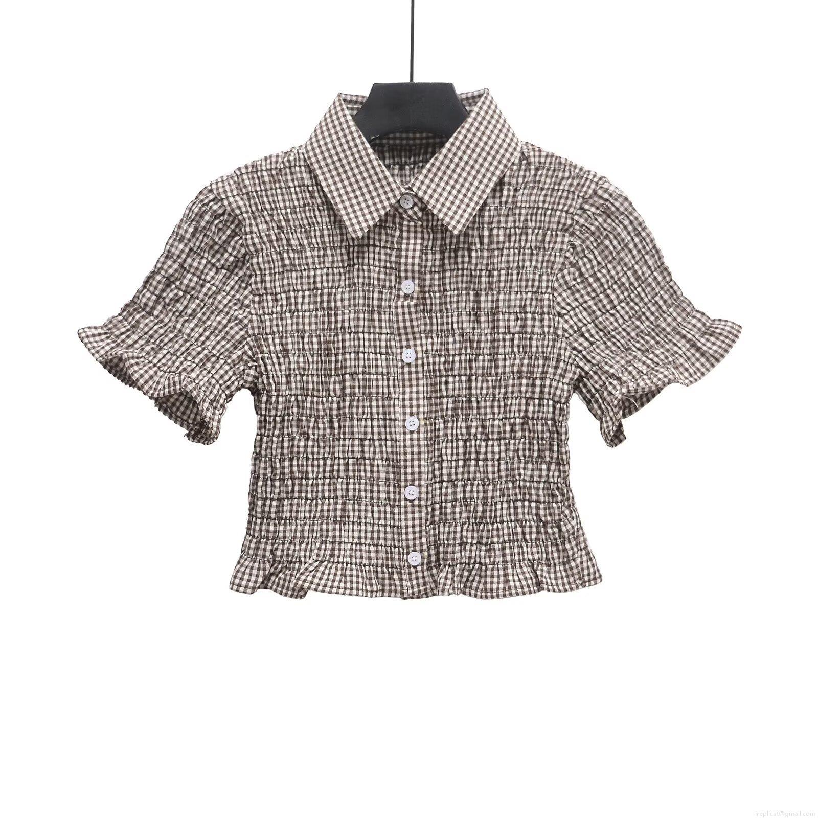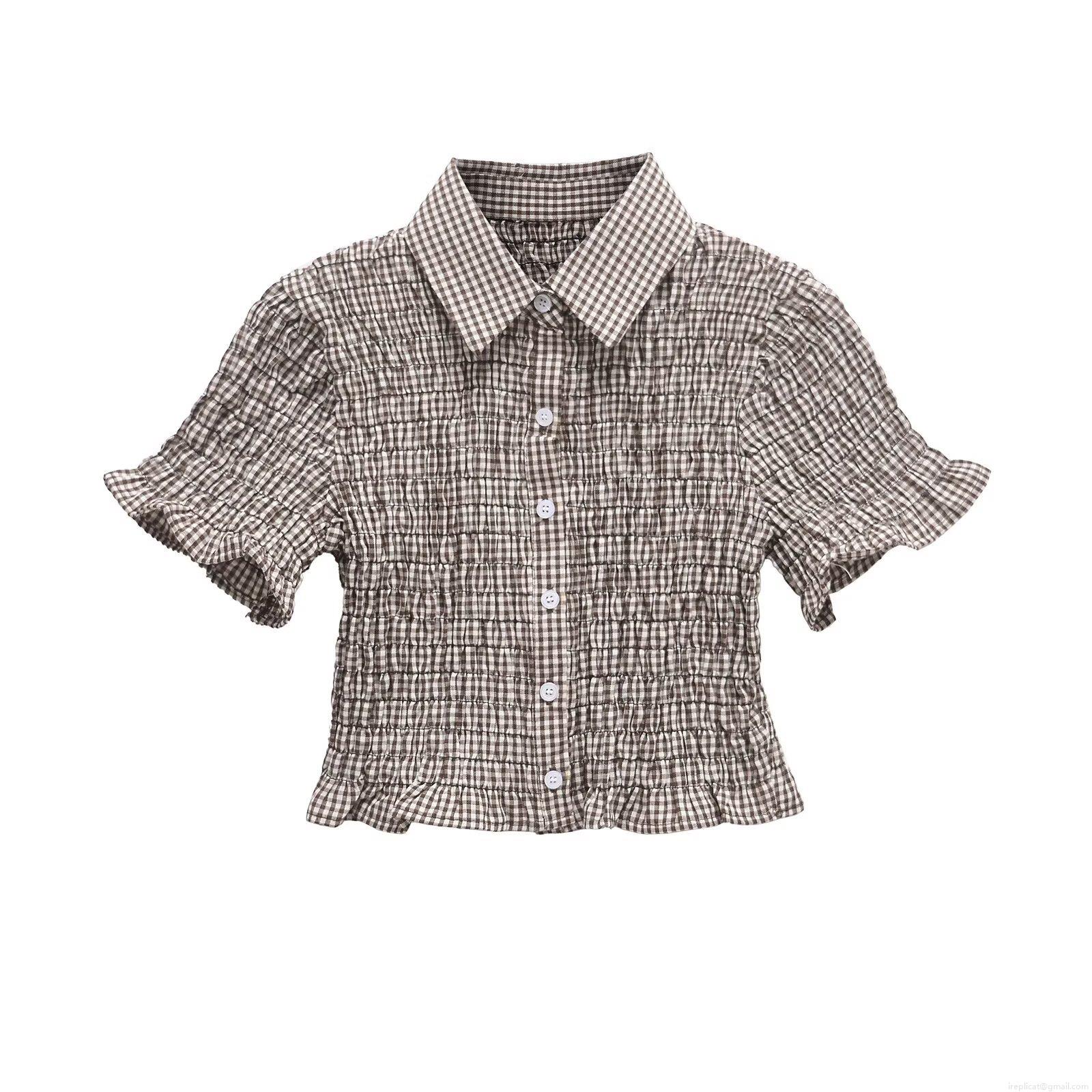 • Women's Smocked Plaid Shirt Brown White Gingham Short Sleeve Button Down Cropped Top With Ruffle Trim And Turnover Collar Vintage Sweet Summer Blouse For Women Daily Wear