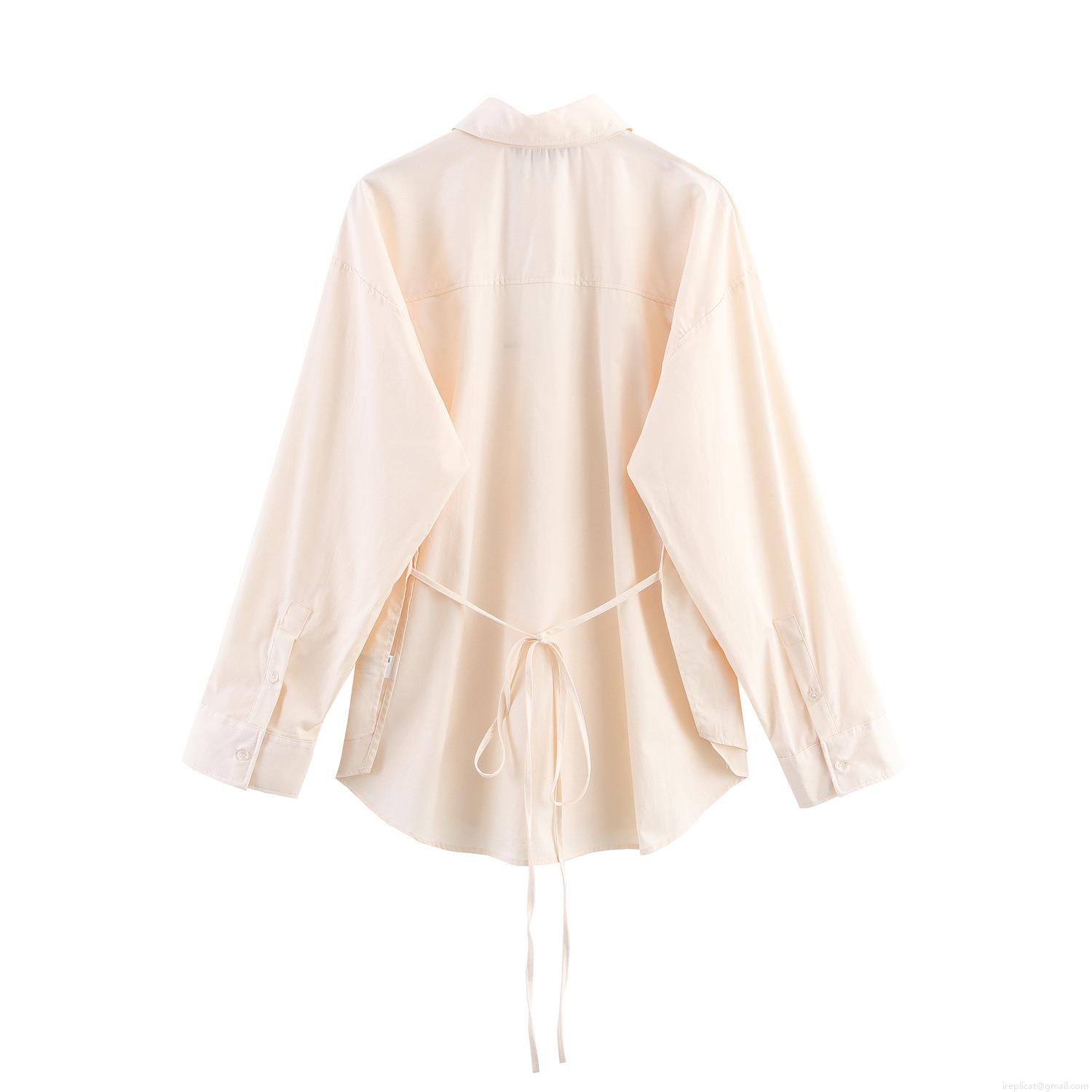 • Women's Solid Color Loose Blouse Polyester Spandex Button Down Long Sleeve Shirt With Back Bow Tie Design For Casual Daily Office Work