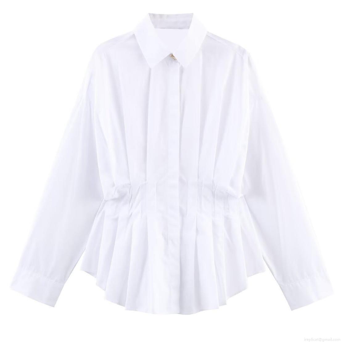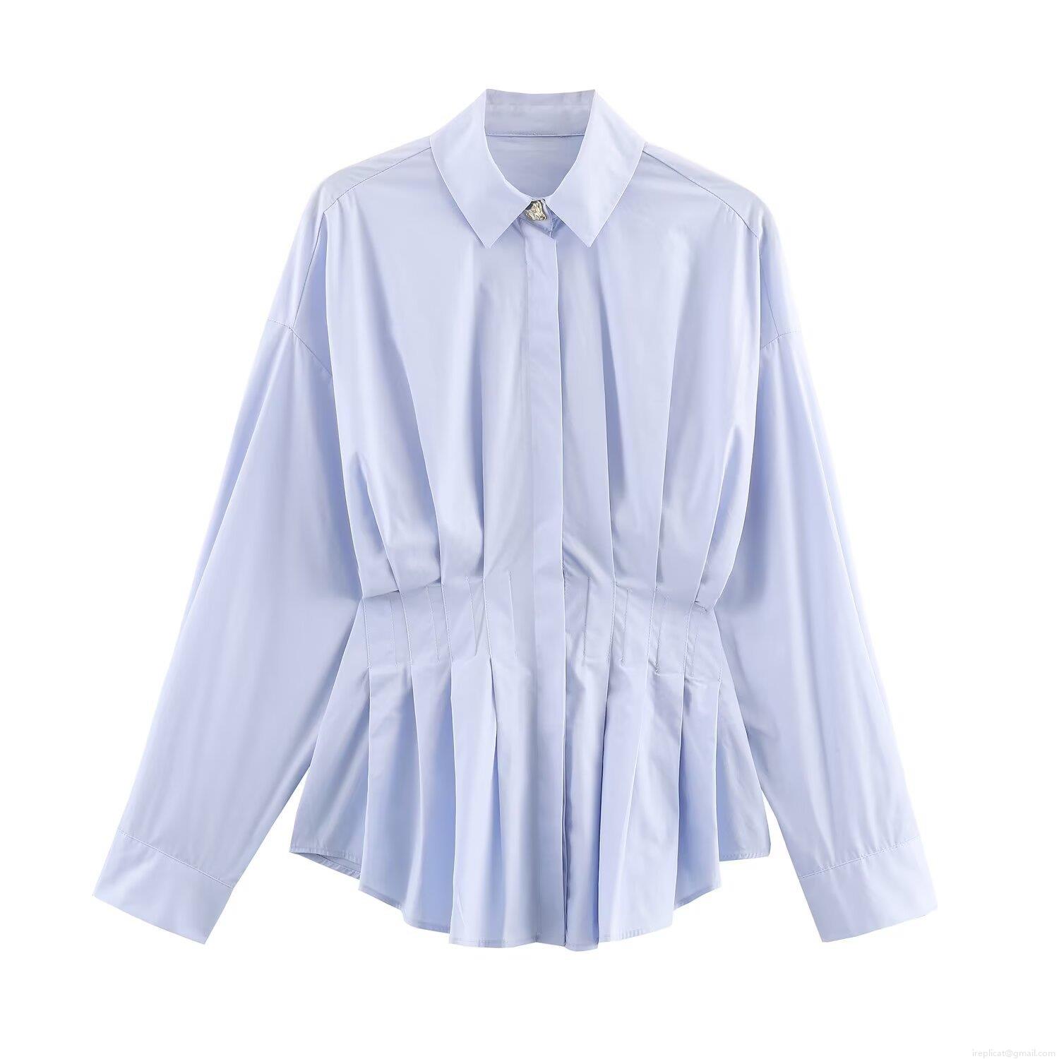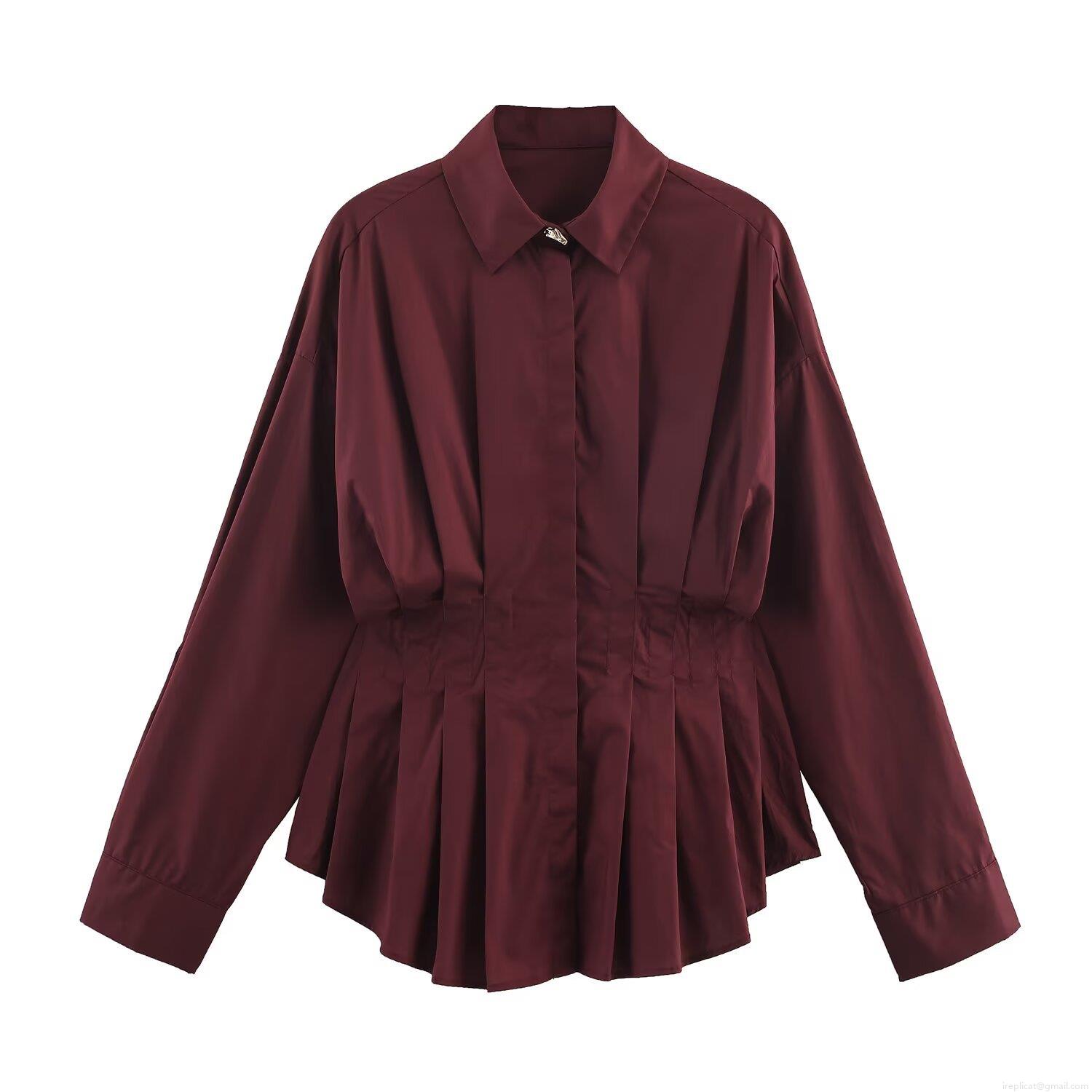 • Women's Solid Color Pleated Waist Poplin Blouse Elegant Long Sleeve Button Down Shirt Slim Fit Office Lady Commuter Tops