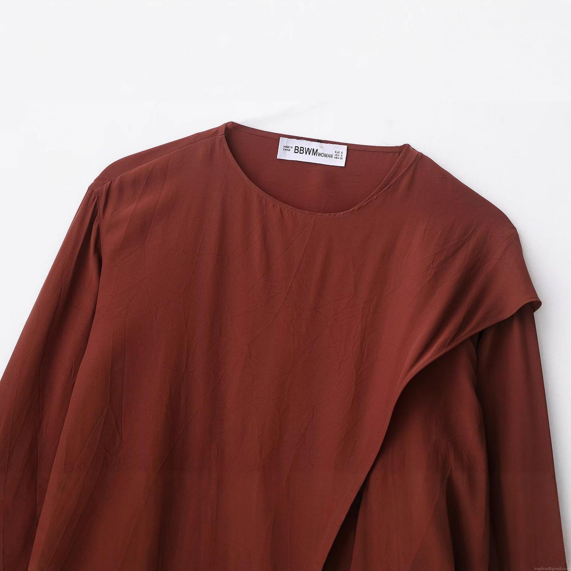 • Women's Solid Rust Red Long Sleeve Round Neck Blouse With Asymmetric Draped Hem And Tie Detail Casual Streetwear Polyester Shirt