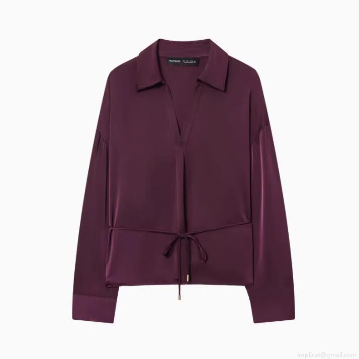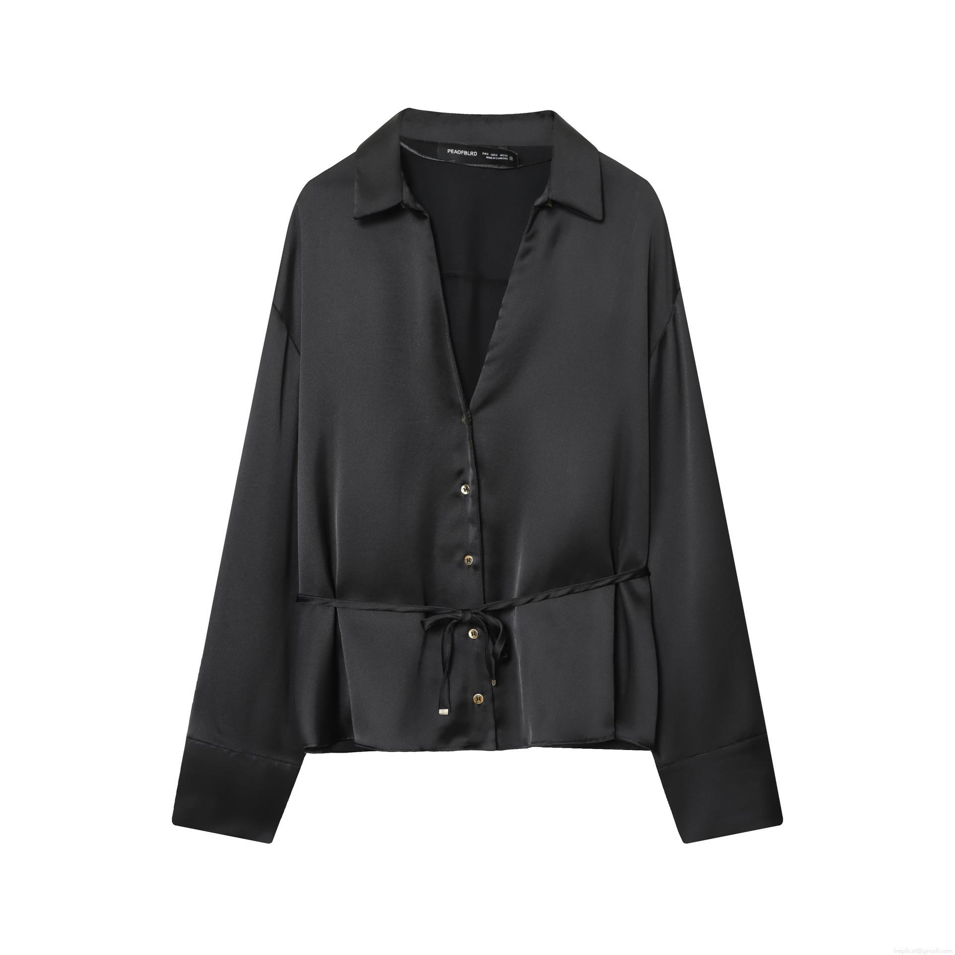 Women's Sophisticated Black Long Sleeve Acetate Satin Blouse With Gold Buttons And Waist Tie Elegant Deep V Neck Shirt For Office Party Lady