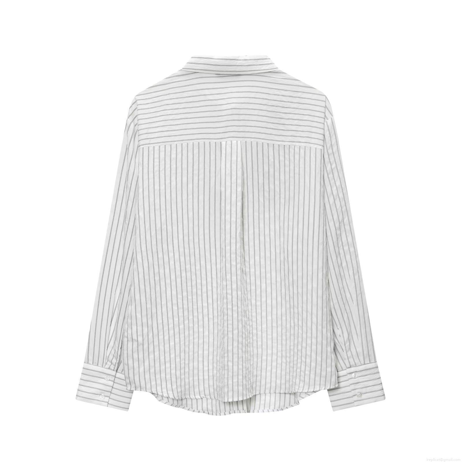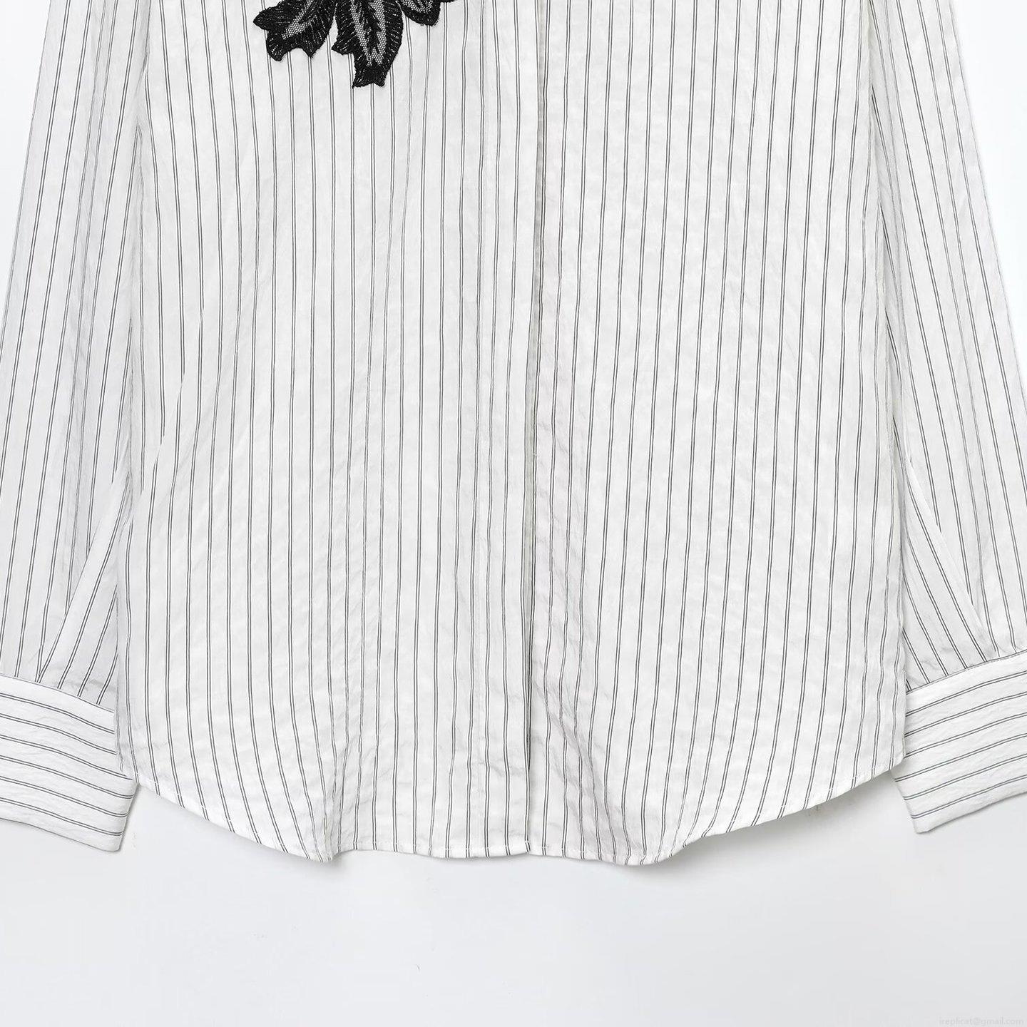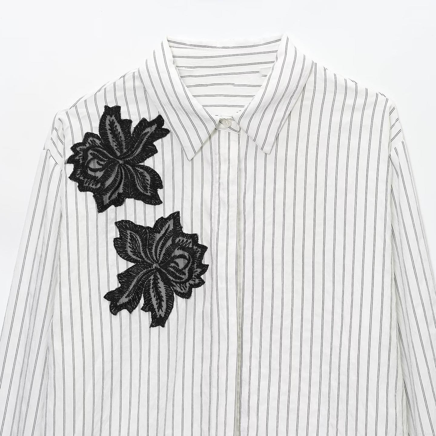 • Women's Striped Blouse With 3D Flower Applique Cotton Polyester Long Sleeve Lapel Shirt Casual Loose Tops For Office Daily Wear Women Clothing