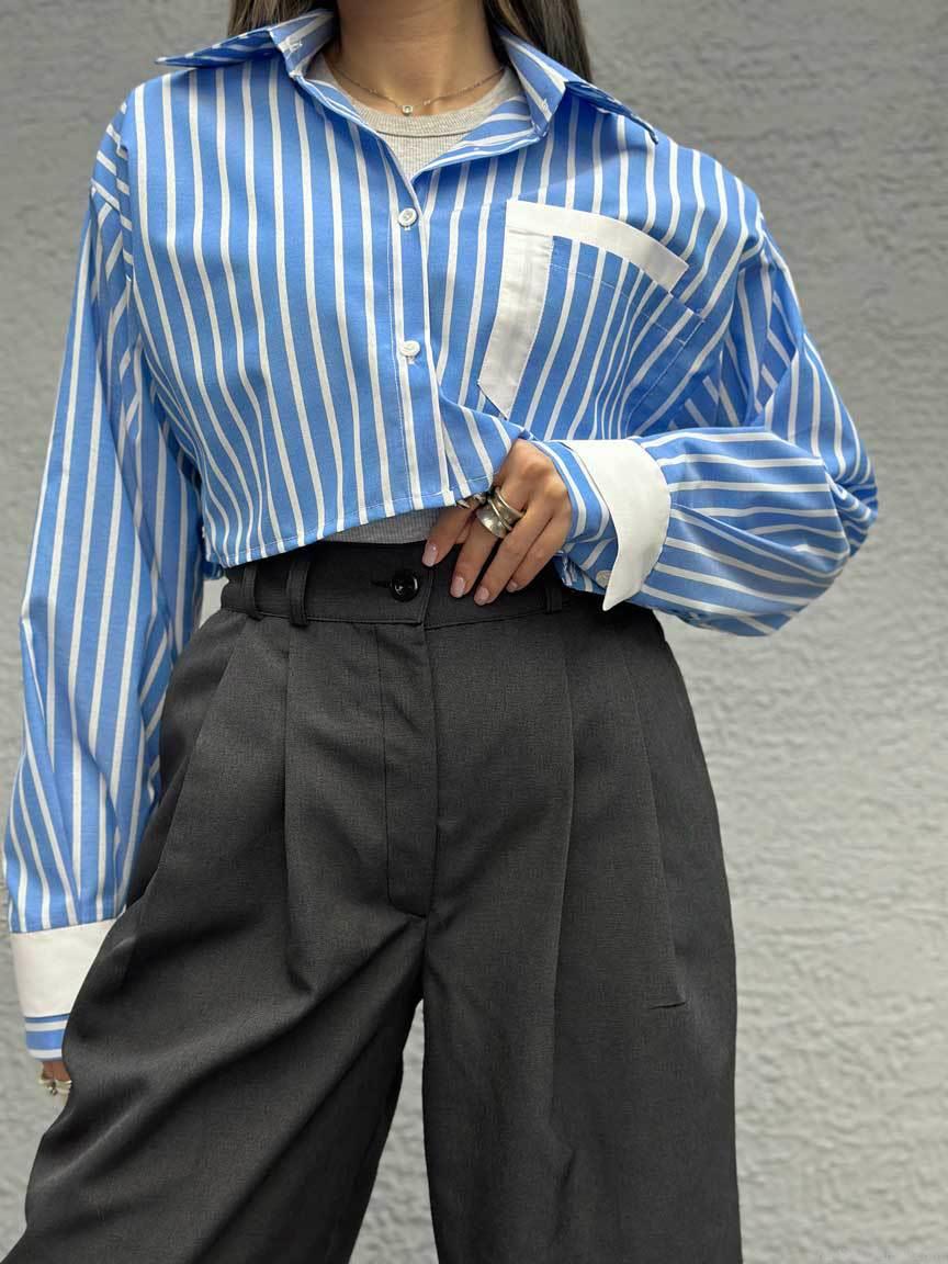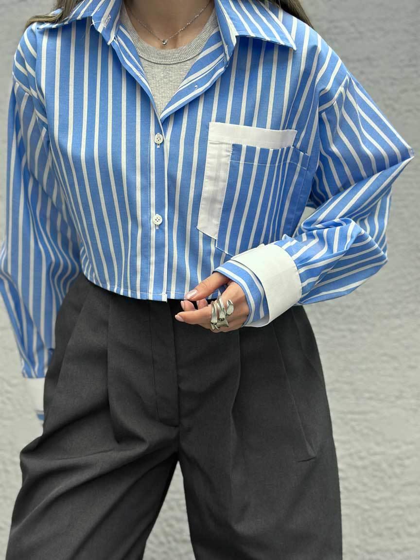 • Women's Striped Cropped Shirt Long Sleeve Cotton Blend Contrast Lapel Patchwork Pocket Blouse High Street Casual Spring Summer Top