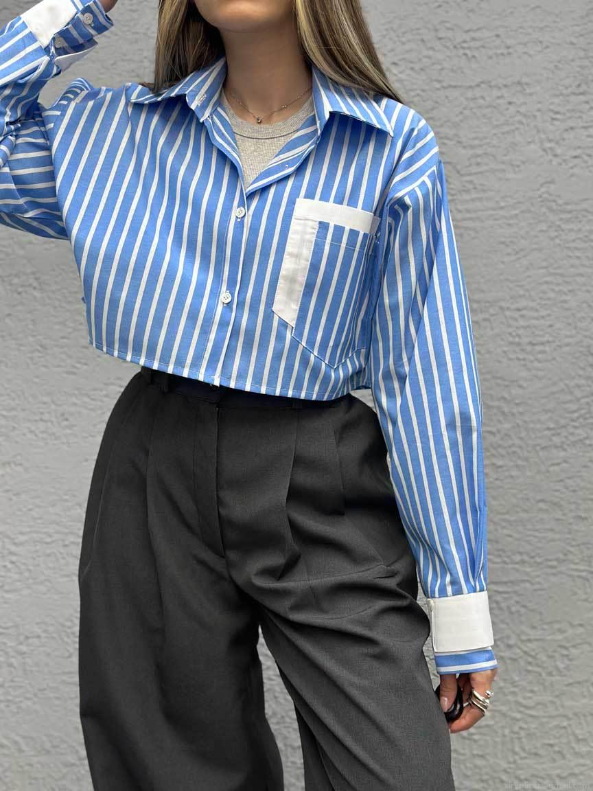 Women's Striped Cropped Shirt Long Sleeve Cotton Blend Contrast Lapel Patchwork Pocket Blouse High Street Casual Spring Summer Top