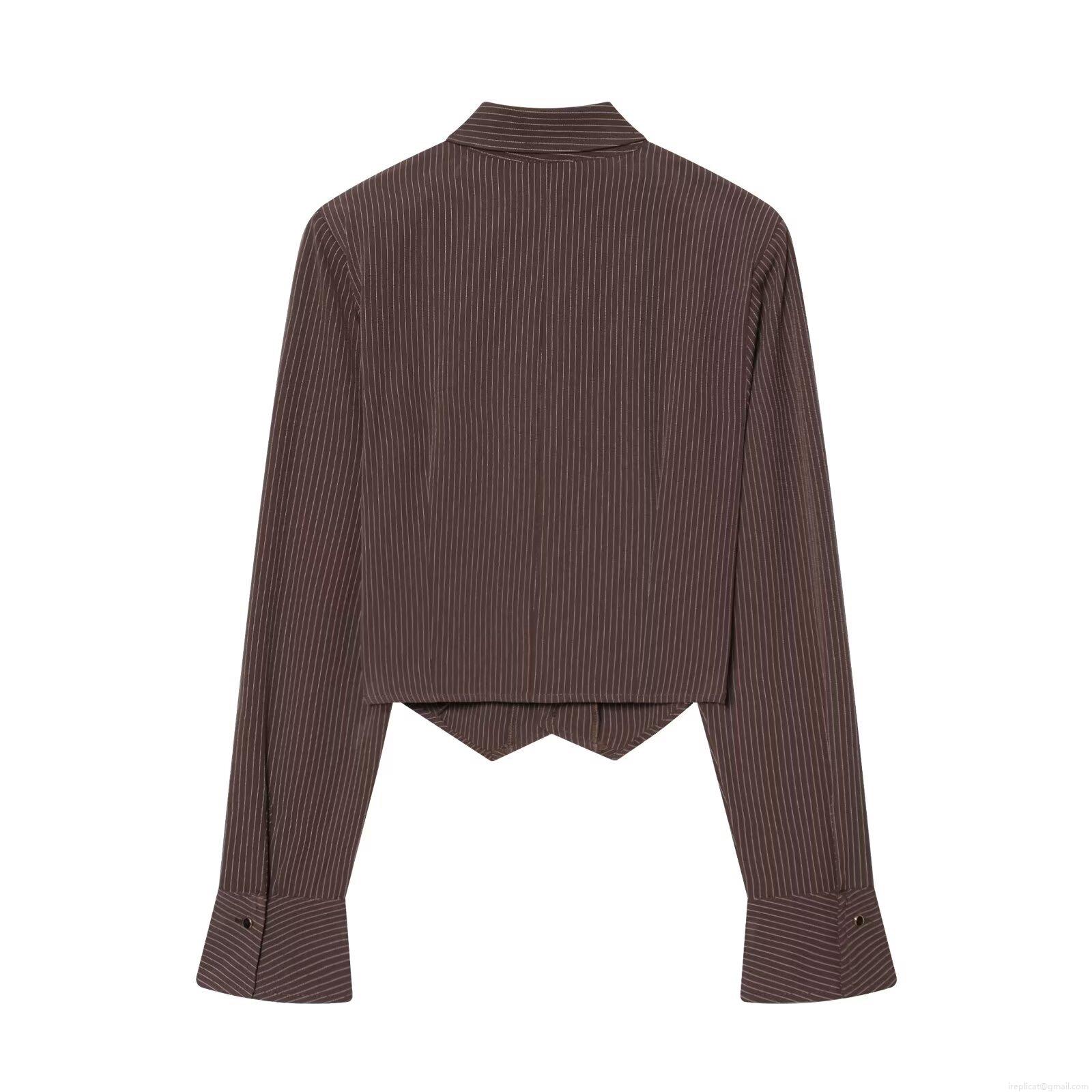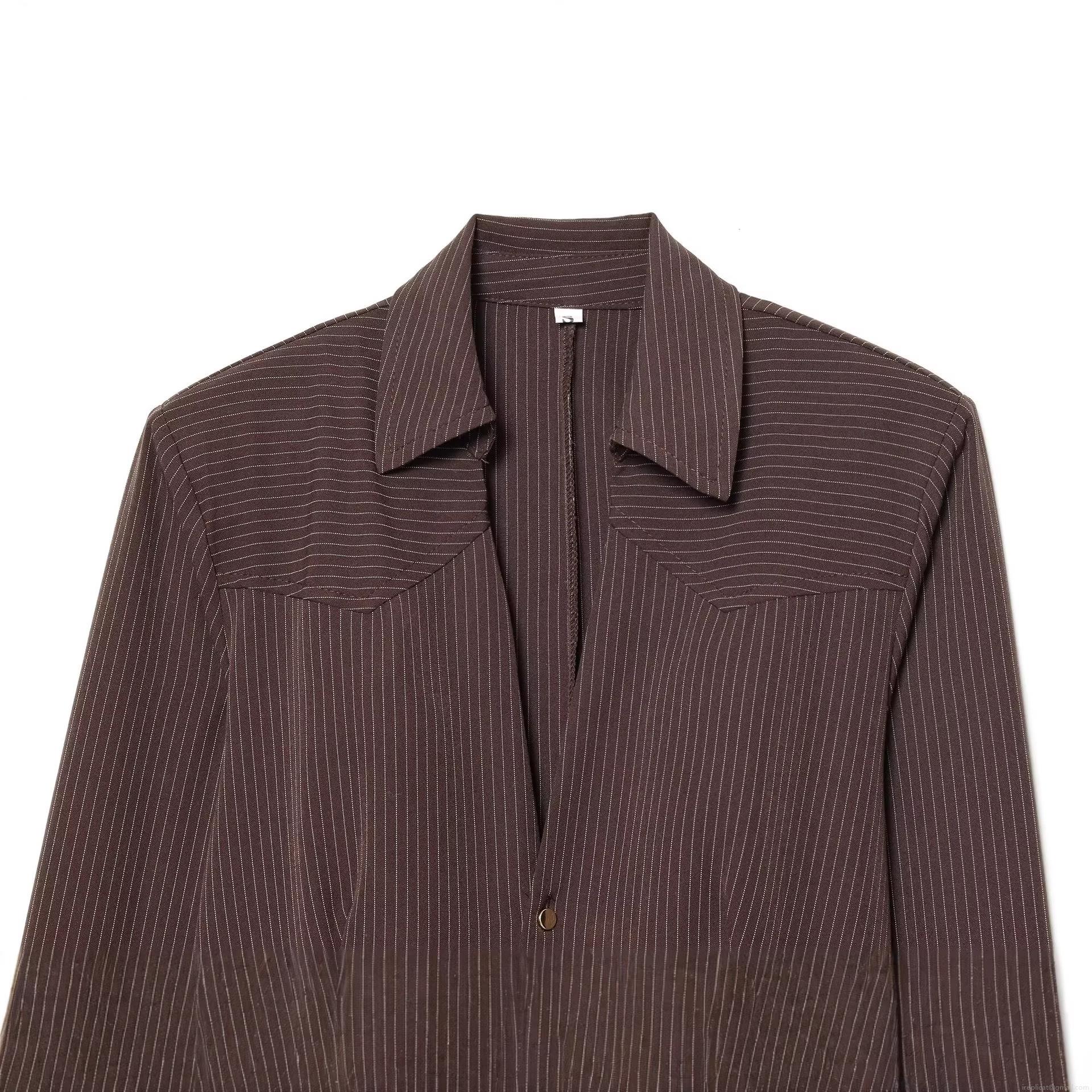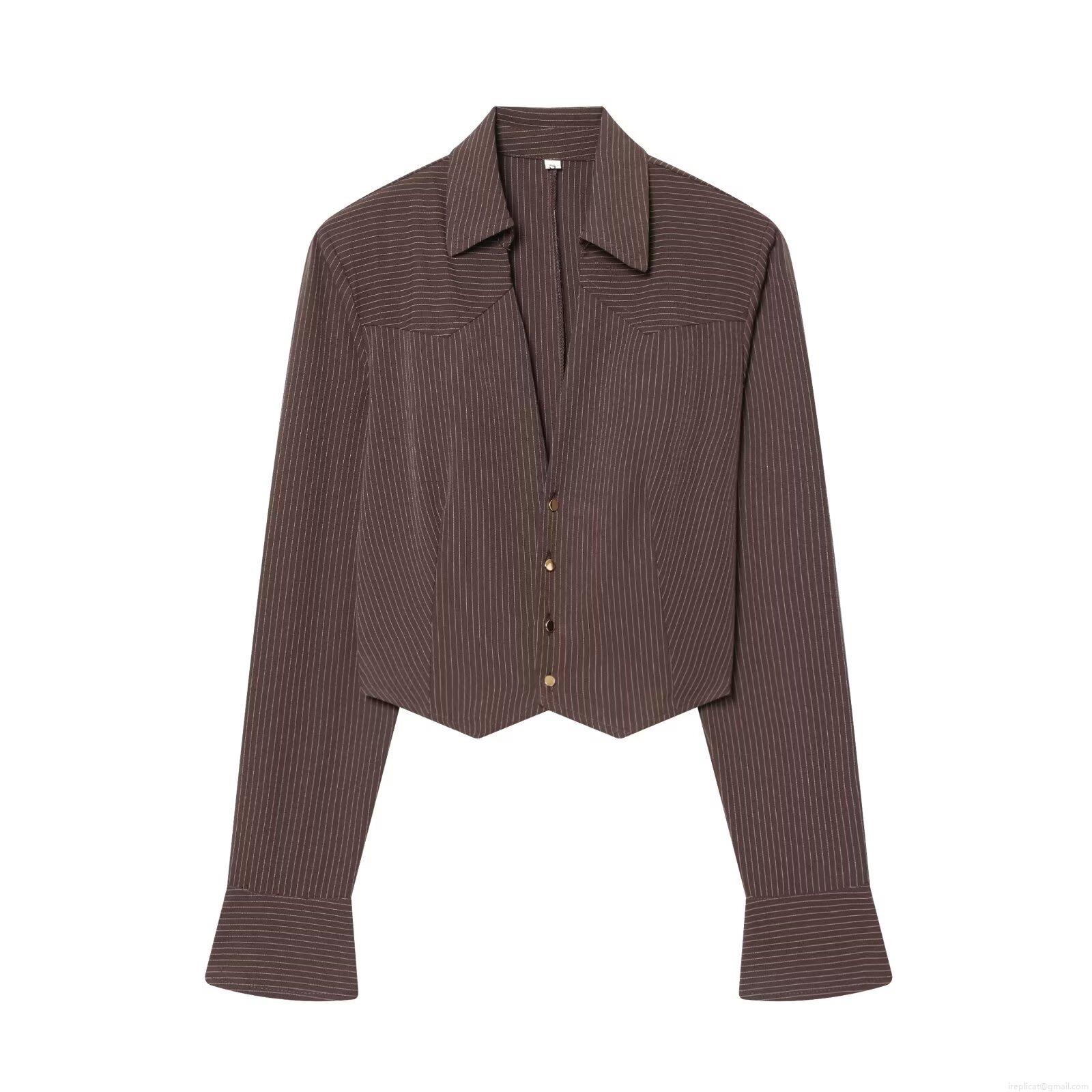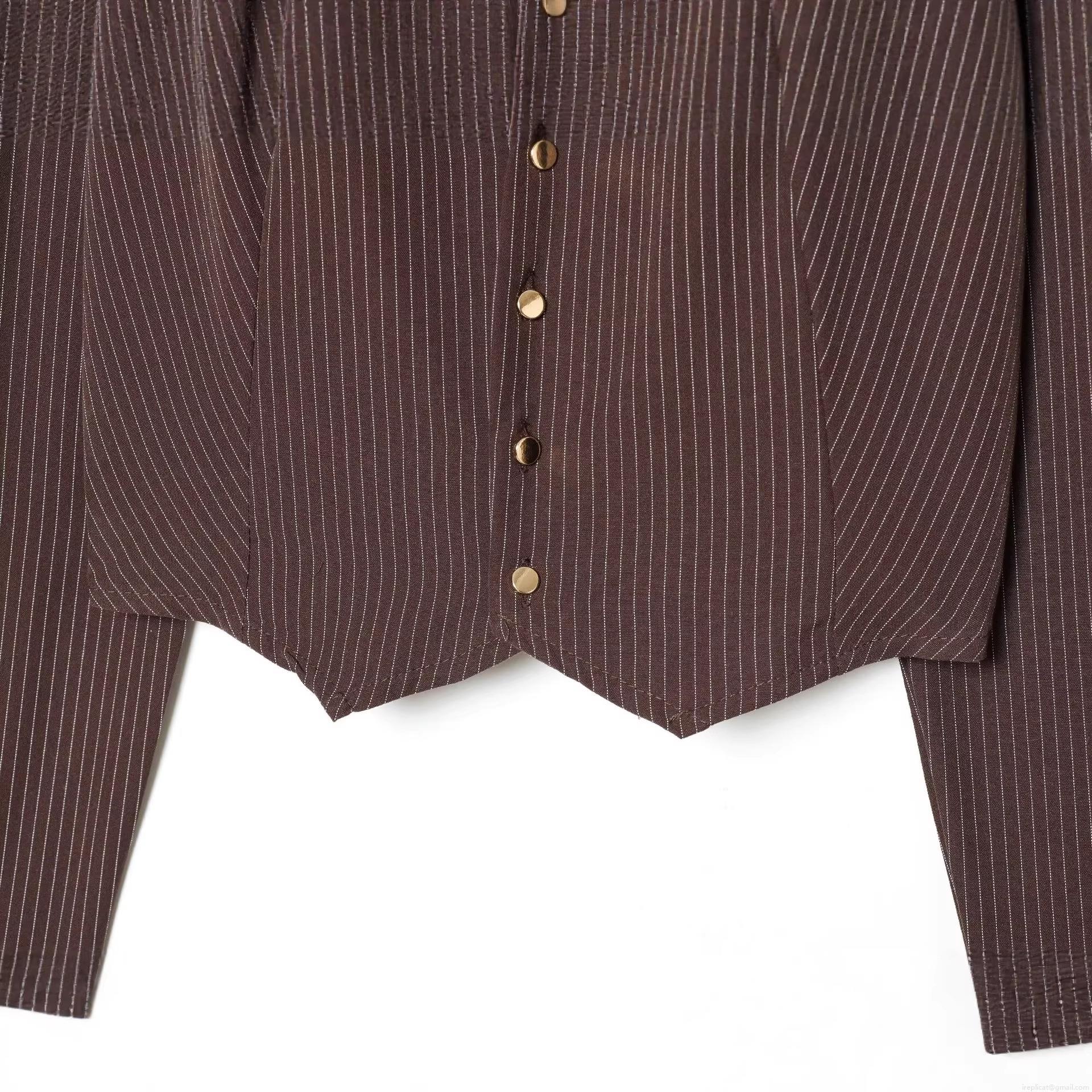 • Women's Striped Cropped Shirt With Padded Shoulders Deep V-Neck Gold Buttons Long Sleeve Polyester Blouse For Office Lady Elegant Retro Brown Tops