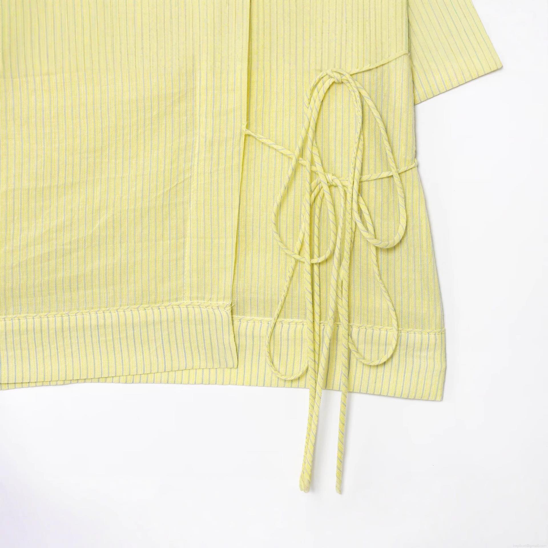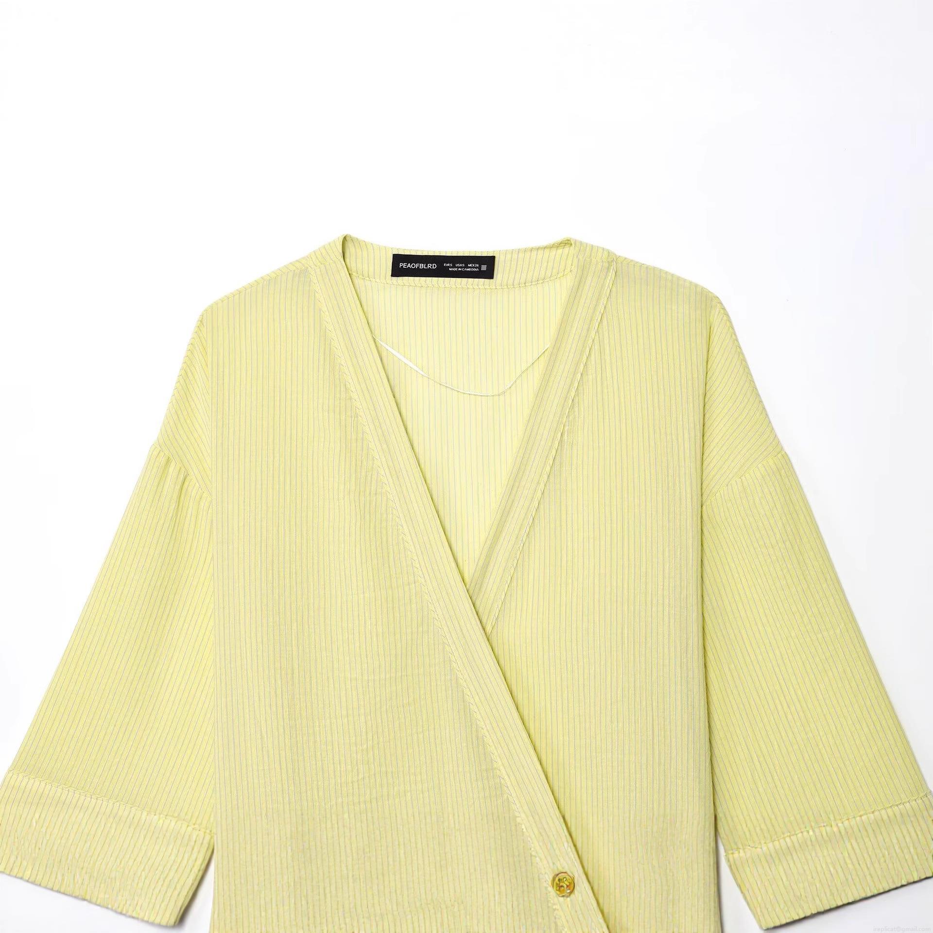 • Women's Striped Kimono Style Wrap Blouse Slub Cotton V-Neck 3/4 Sleeve Casual Tie Side Bow Shirt For Daily Vacation Light Yellow Top