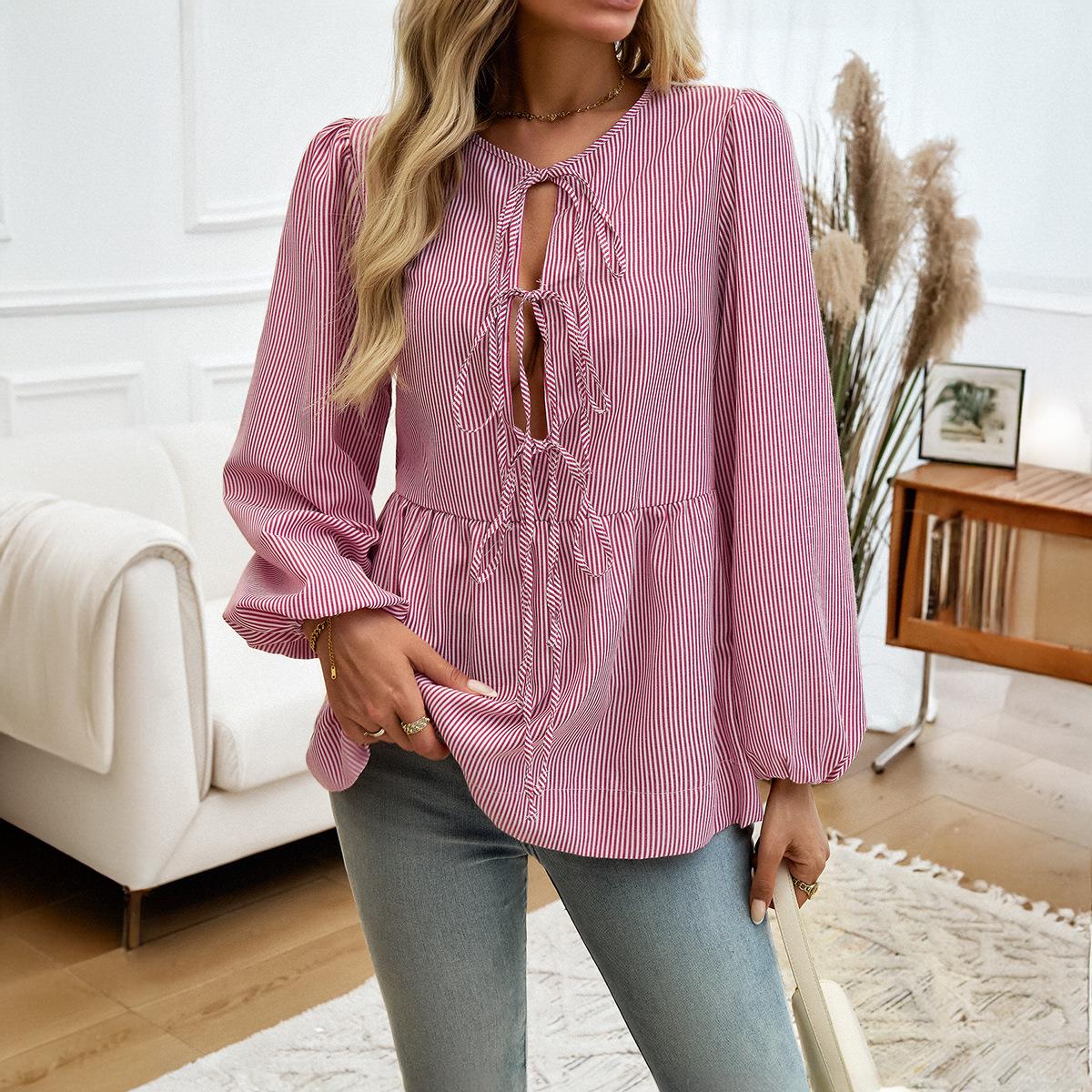 • Women's Striped Lantern Sleeve Blouse Casual Loose Lace-Up V-Neck Shirt With Ruffle Hem 100% Polyester Long Sleeve Tops For Daily Wear