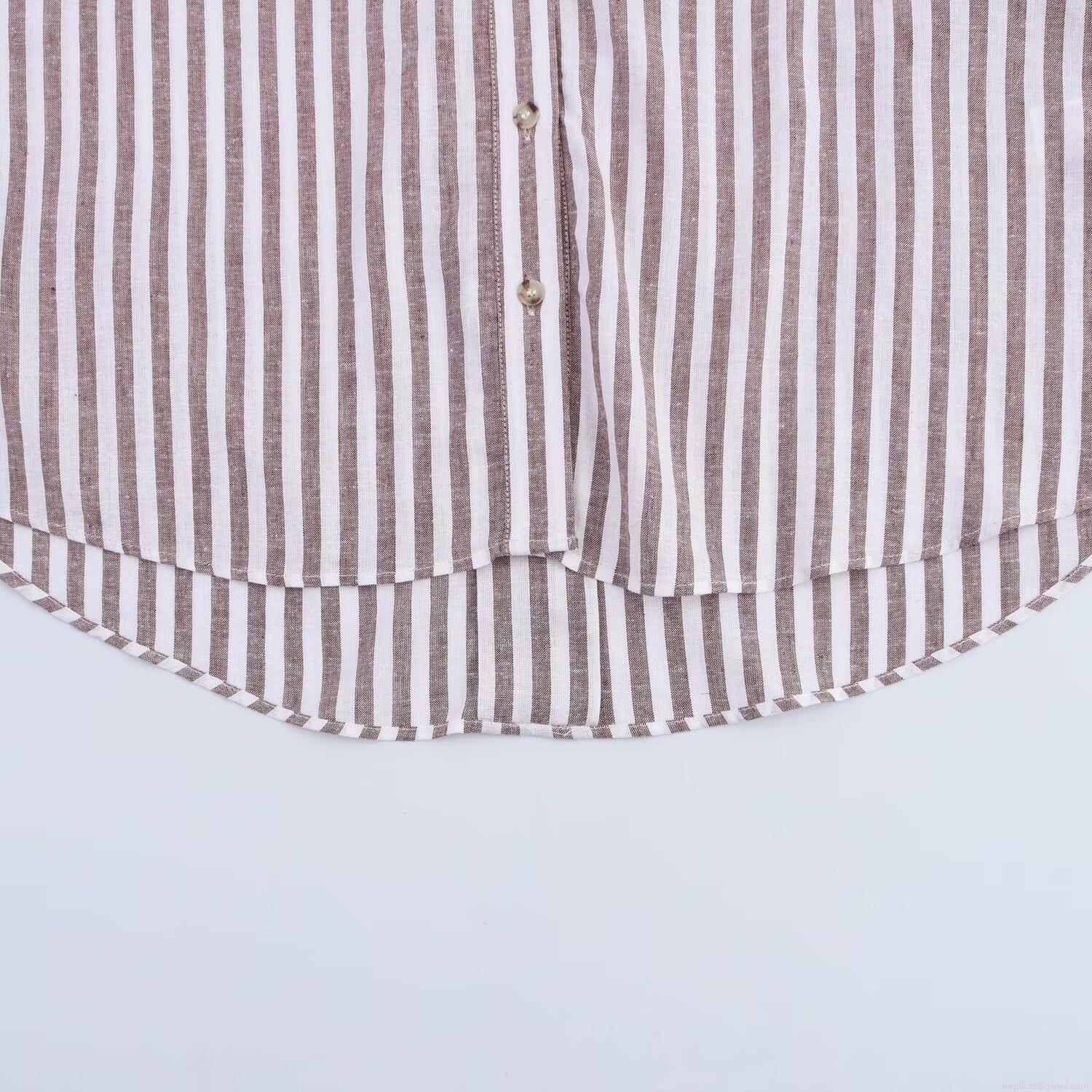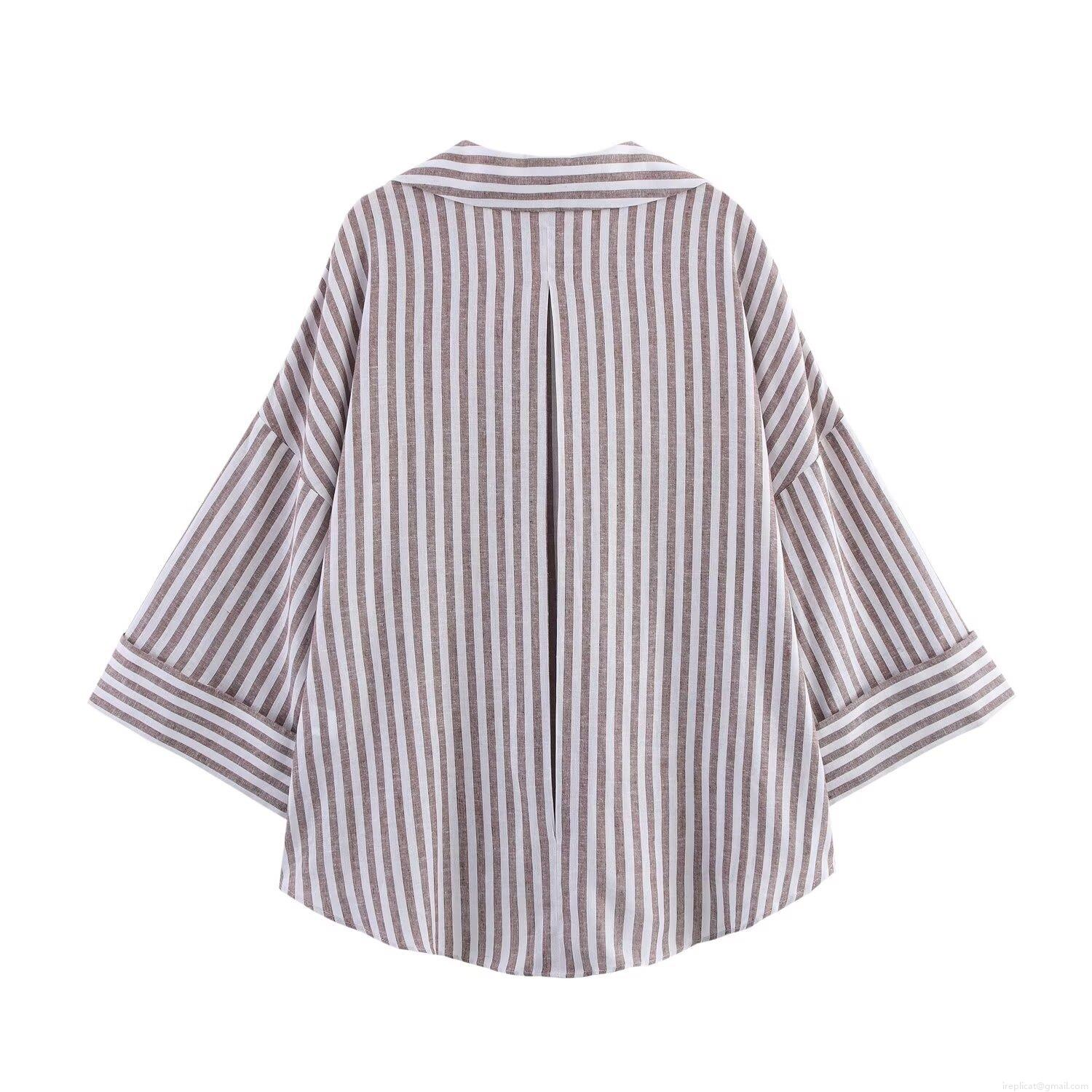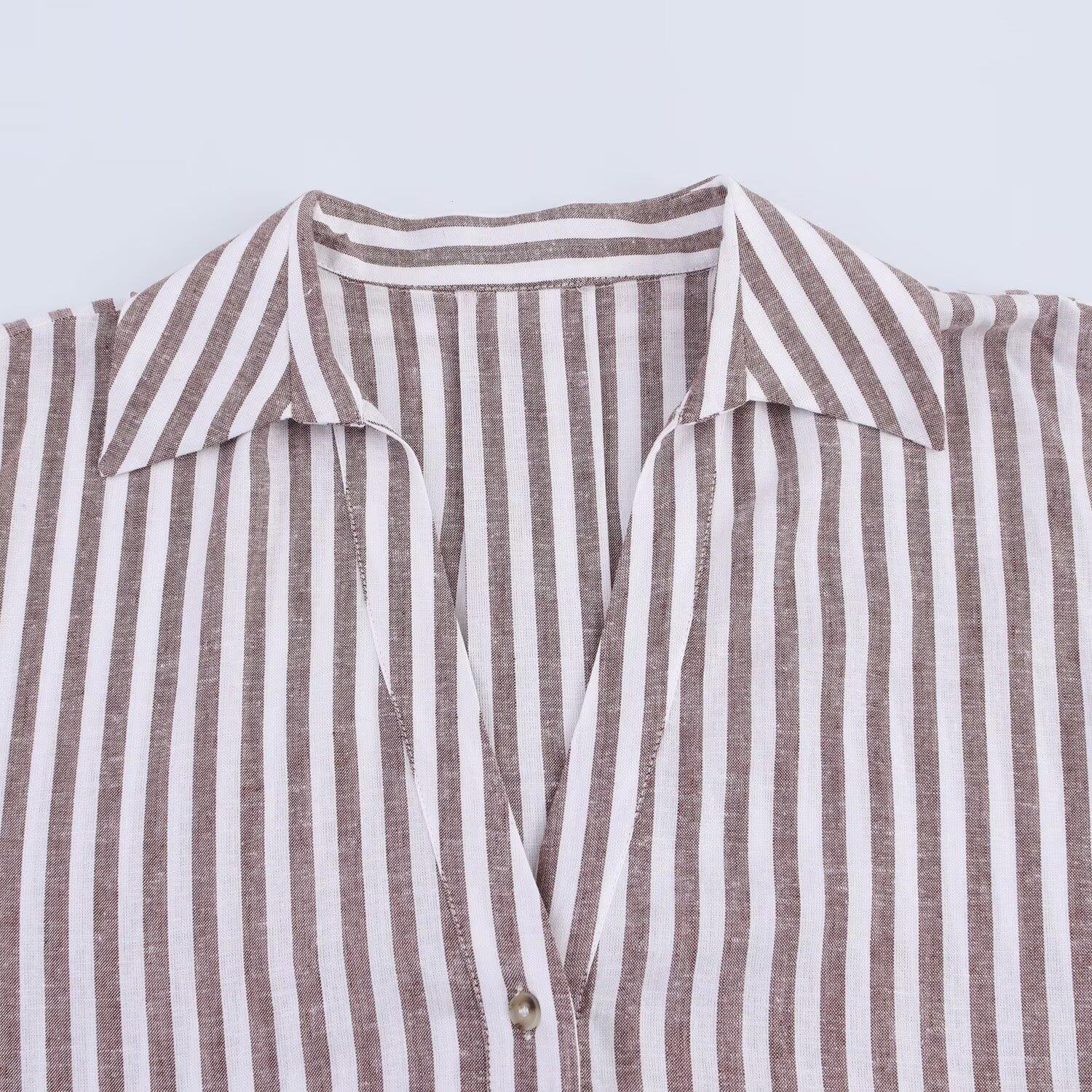 • Women's Striped Linen Blend Shirt Casual V-Neck Button Down 3/4 Wide Sleeve Loose Blouse For Daily Office Wear Light Brown Spring Summer Top