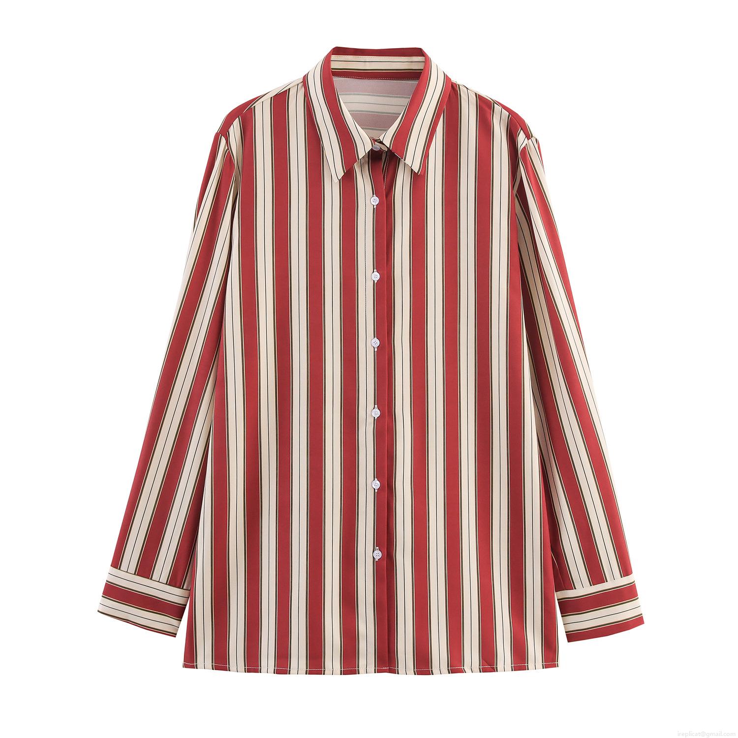 • Women's Striped Long Sleeve Blouse Polyester Lapel Shirt With Back Tie Waist Commuter Office Top Casual Slim Fit Vertical Stripe Button Down Shirt