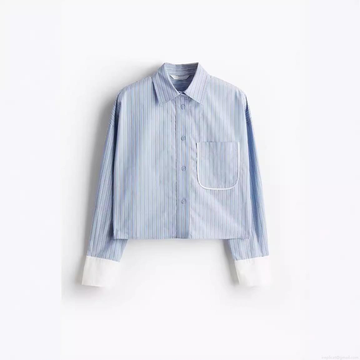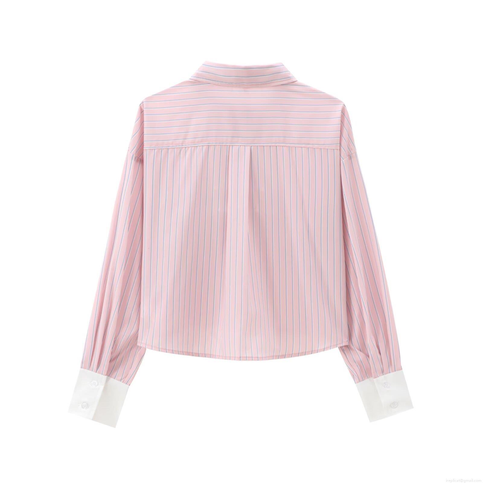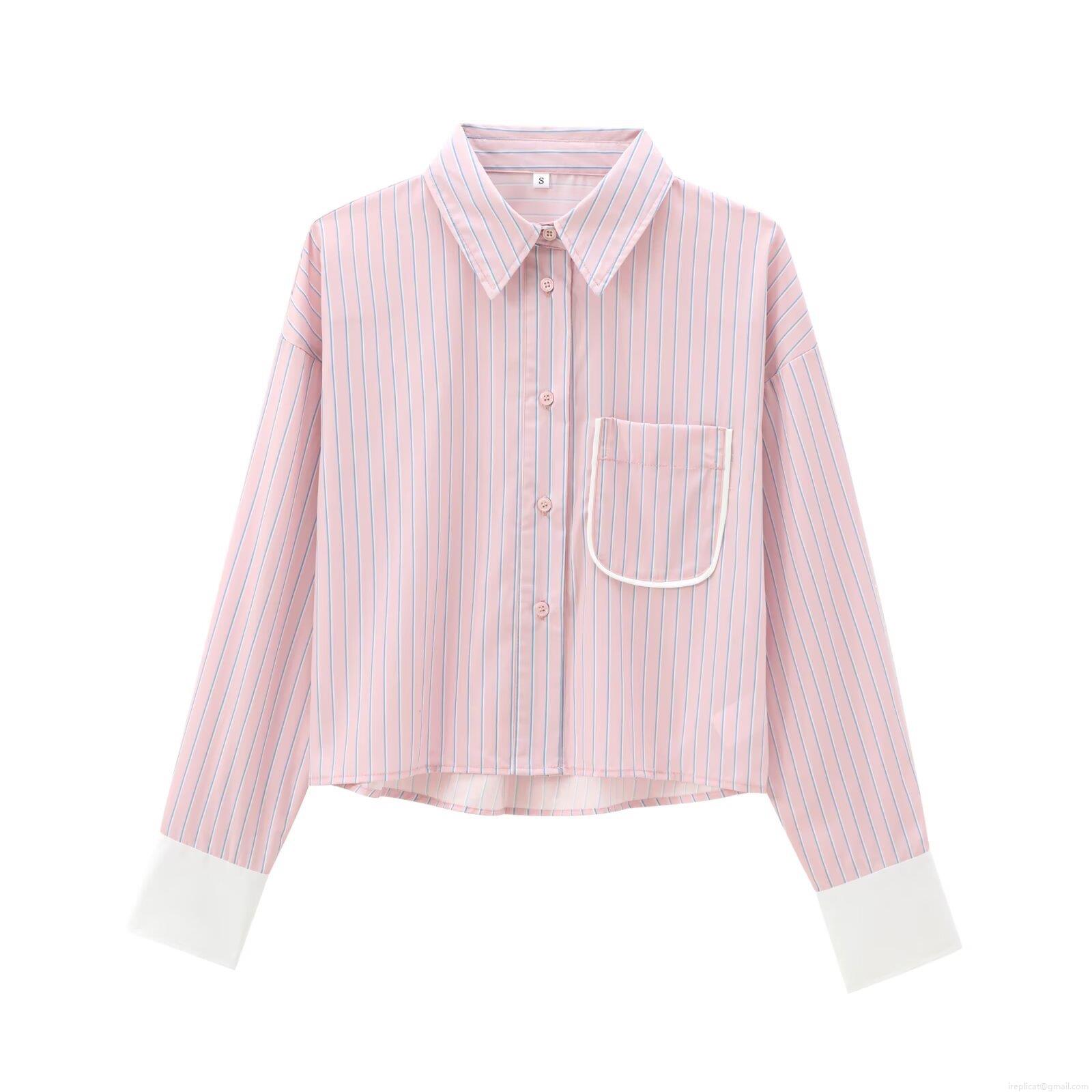 • Women's Striped Long Sleeve Button Down Shirt Contrast Cuffs Chest Pocket Cropped Blouse Polyester Blend Casual Chic Streetwear Tops