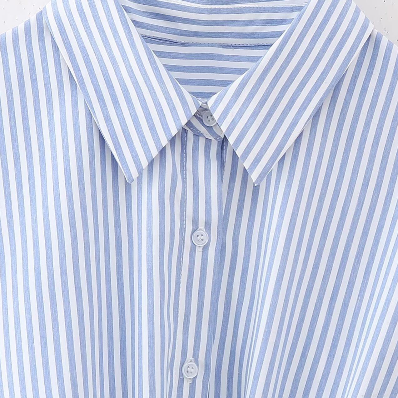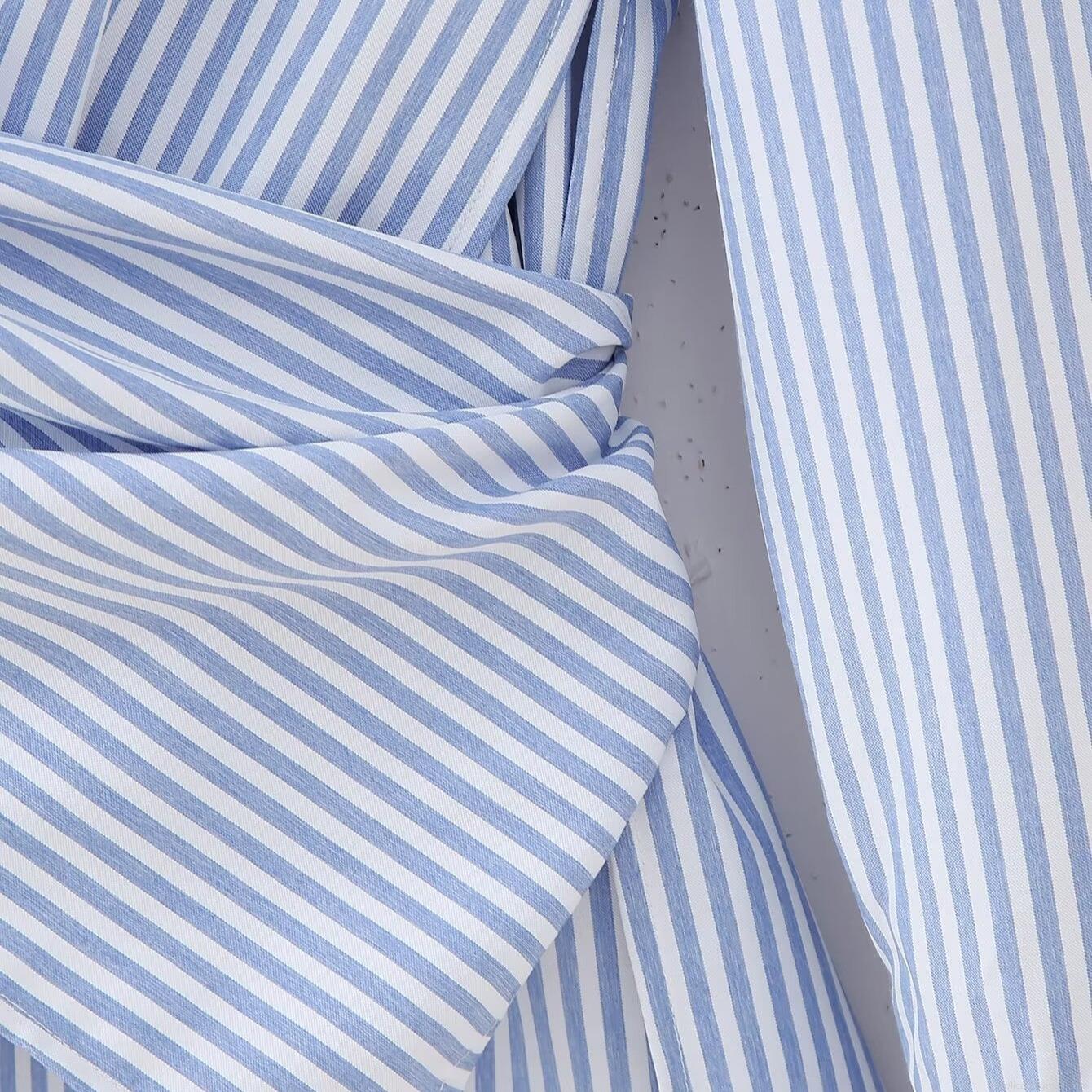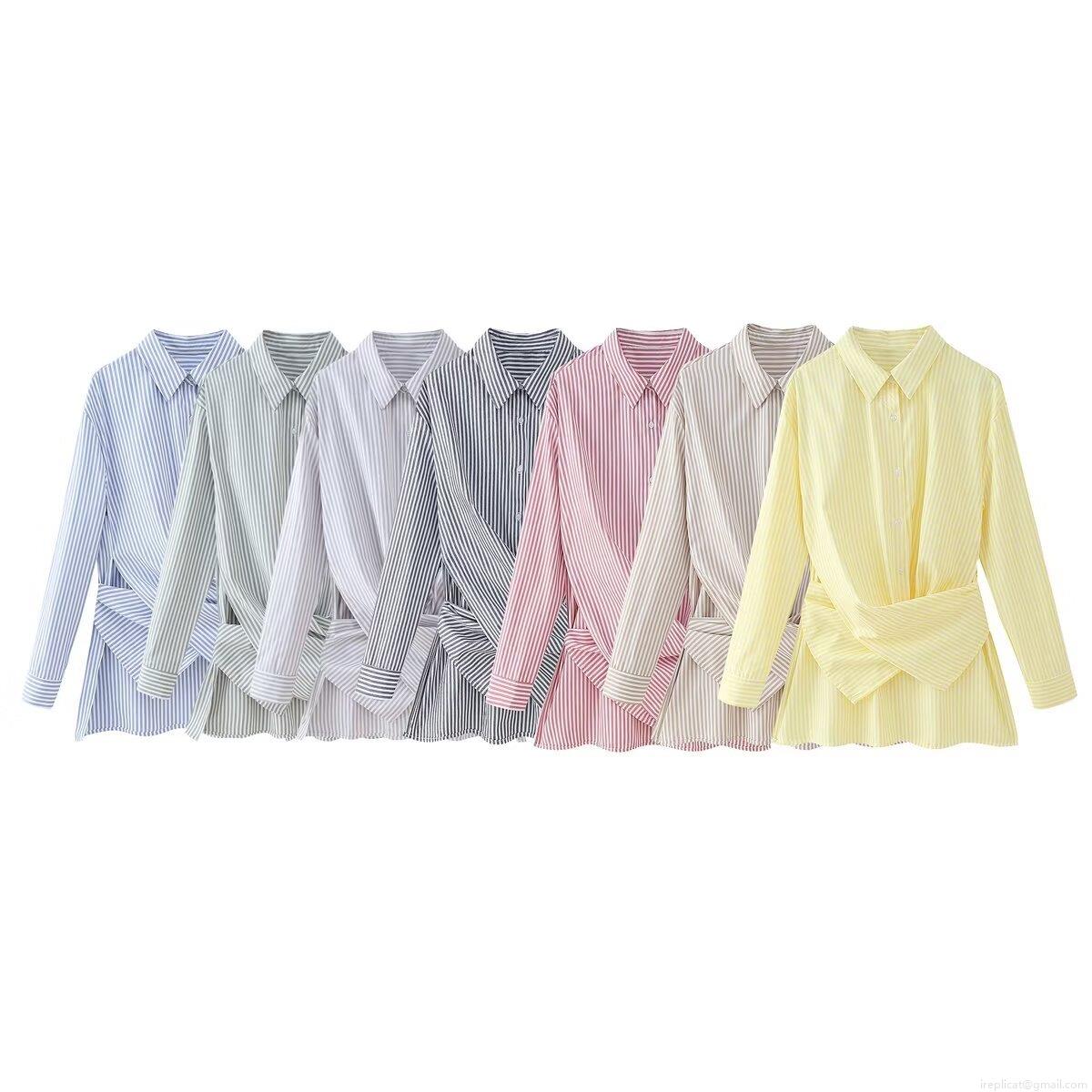 • Women's Striped Long Sleeve Shirt Polyester Blend Casual Loose Blouse With Waist Tie Front Knot Design Fashionable Lapel Button Down Top For Ladies Daily Wear