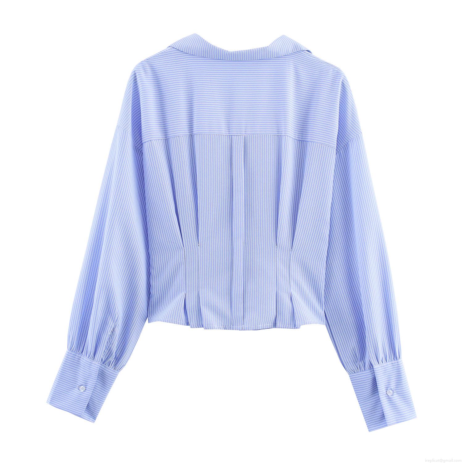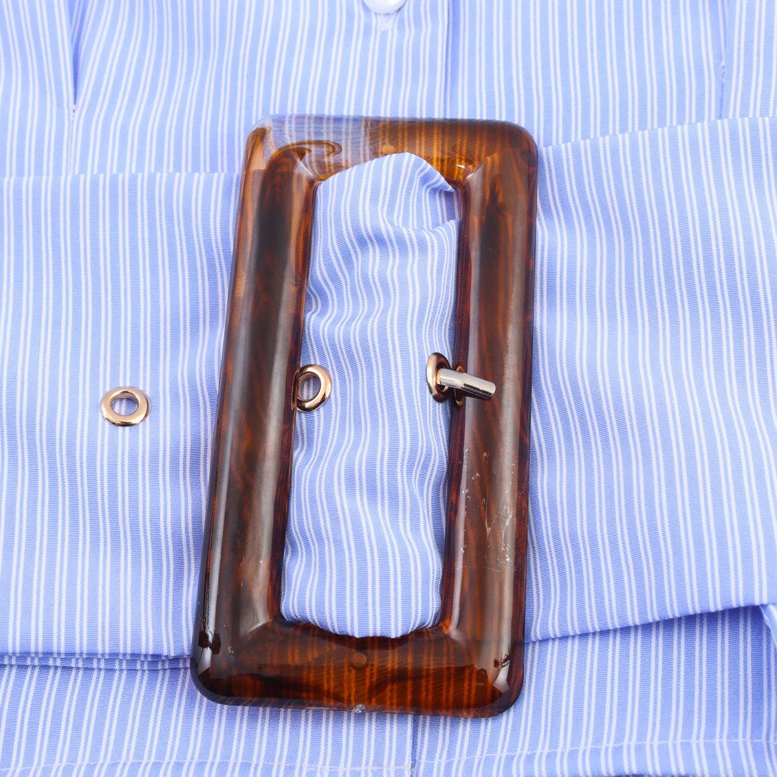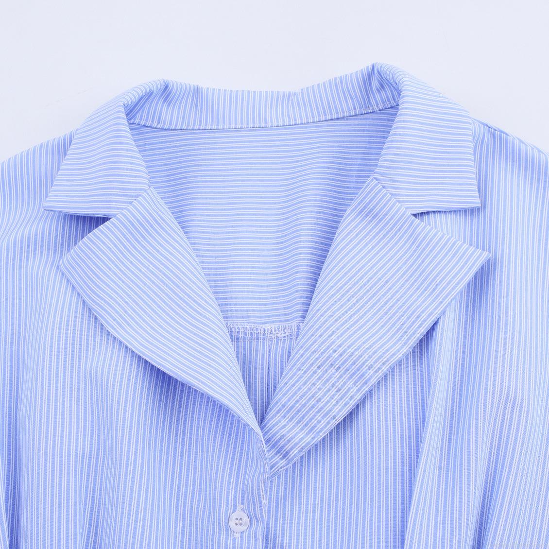 • Women's Striped Long Sleeve Shirt Suit Collar Cropped Blouse With Wide Belt And Tortoiseshell Buckle For Office Commute Elegant Slim Fit Polyester Top