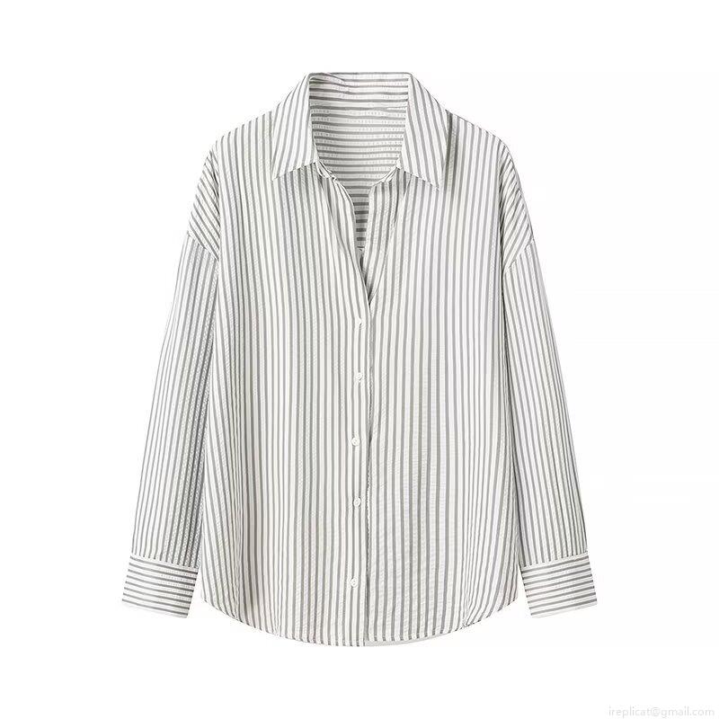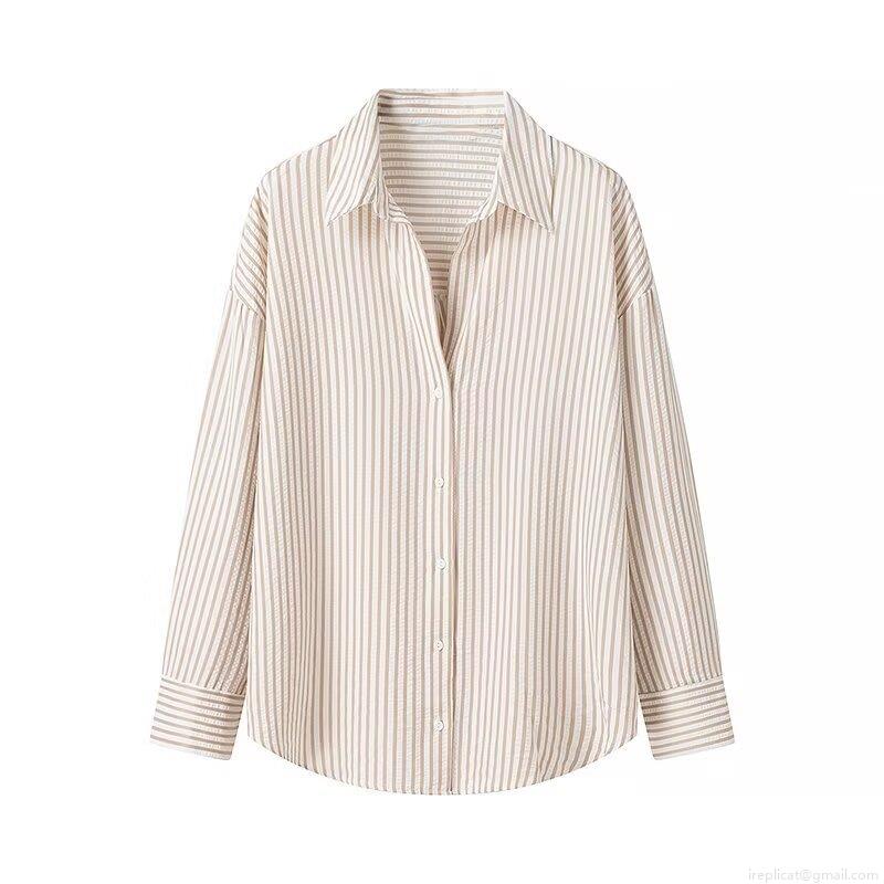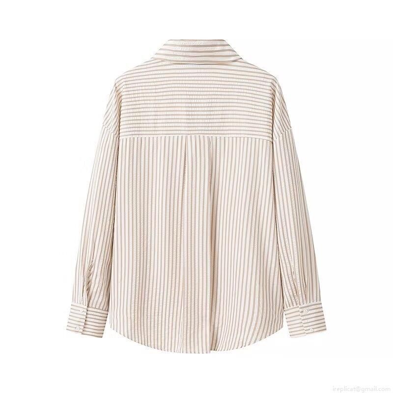 • Women's Striped Polyester Seersucker Long Sleeve Shirt Button Down Casual Oversized Blouse Top For Autumn