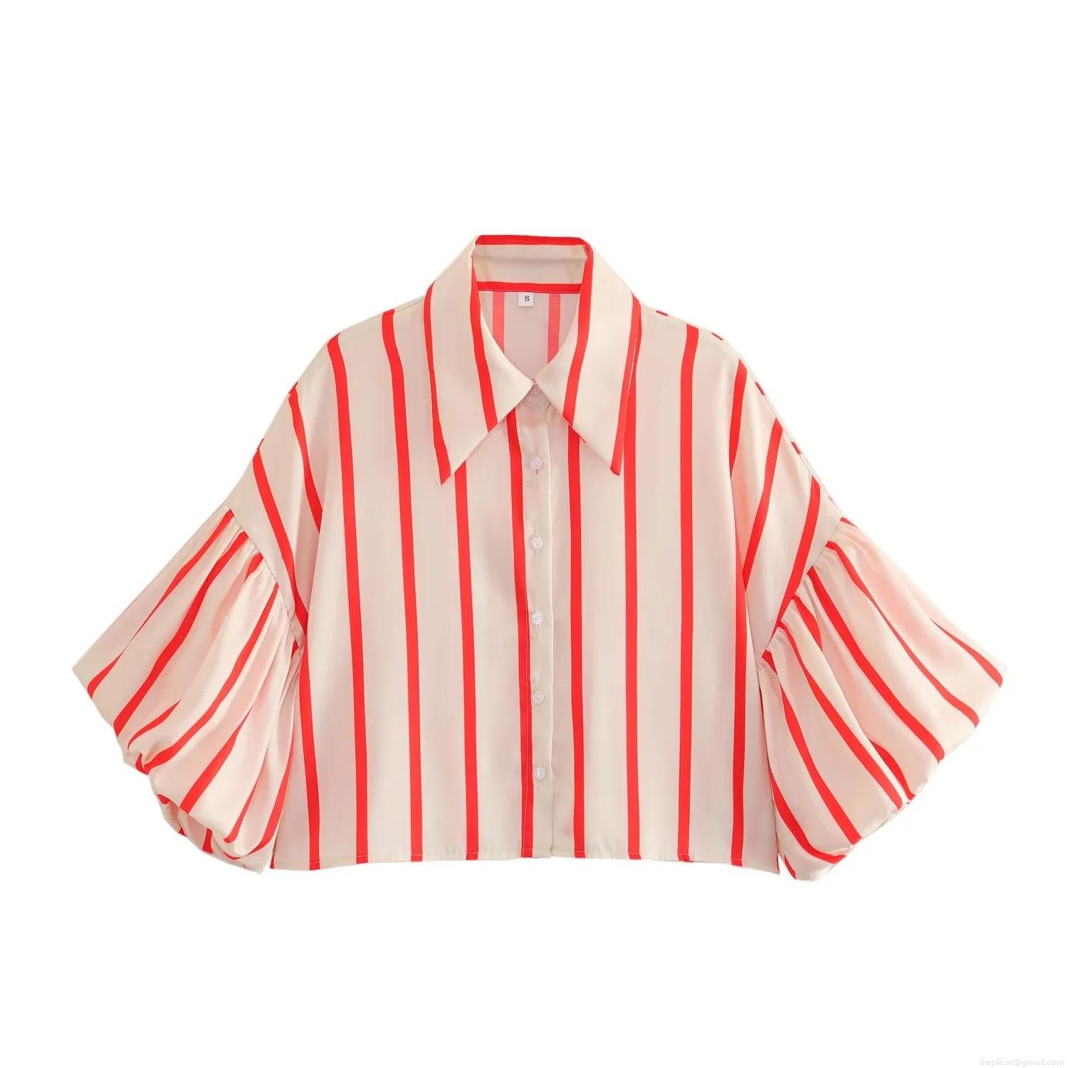 Women's Striped Puff Sleeve Blouse 100% Polyester Short Lantern Sleeve Button Down Casual Shirt Tops For Women Summer Fashion