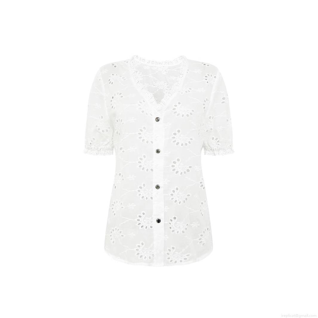 Women's Summer Embroidered Short Sleeve Shirt Casual White Hollow Out V Neck Button Up Top Elegant Scalloped Trim Blouse For Daily Vacation