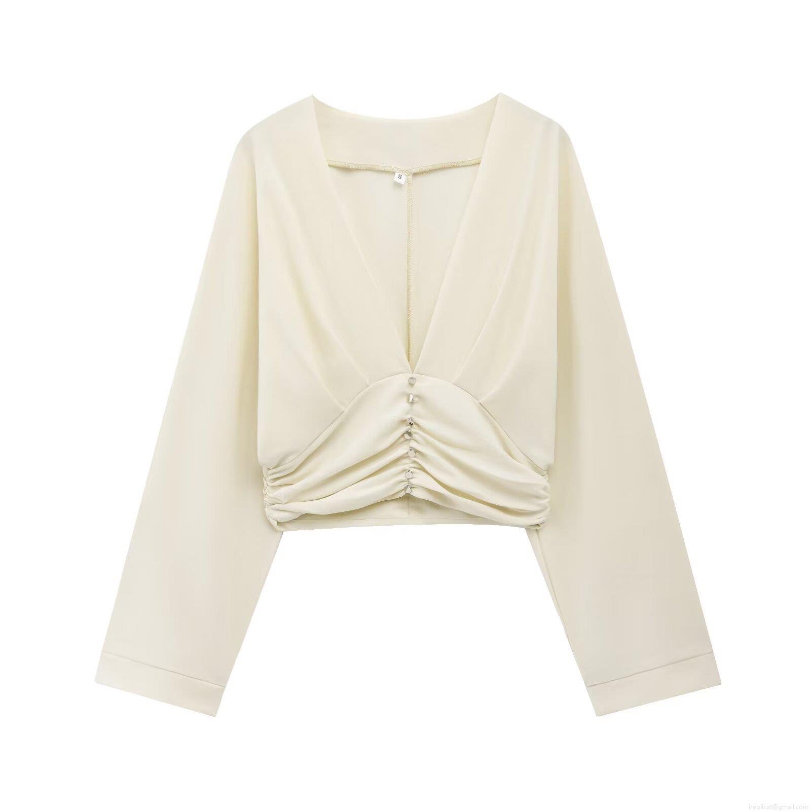 • Women's Summer Fashion V-Neck Long Sleeve Pleated Short Blouse Elegant Solid Color Streetwear Top With Decorative Buttons