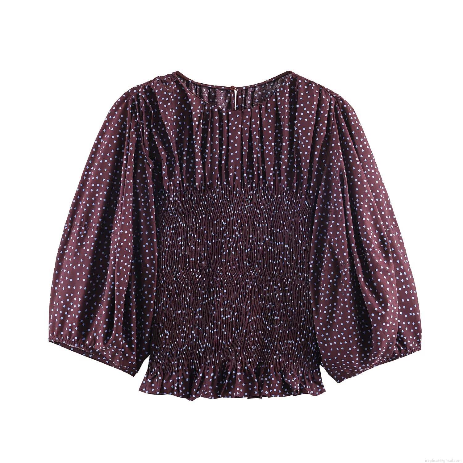 Women's Summer Polka Dot Blouse Polyester Cotton Smocked Waist Balloon Sleeve Top Casual Ruffle Hem Round Neck Shirts Streetwear For Women