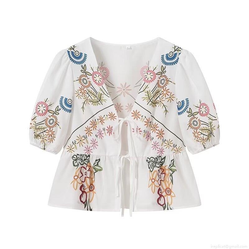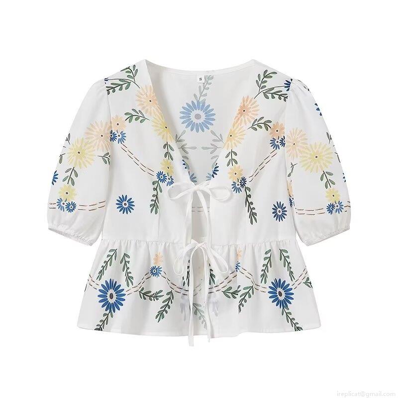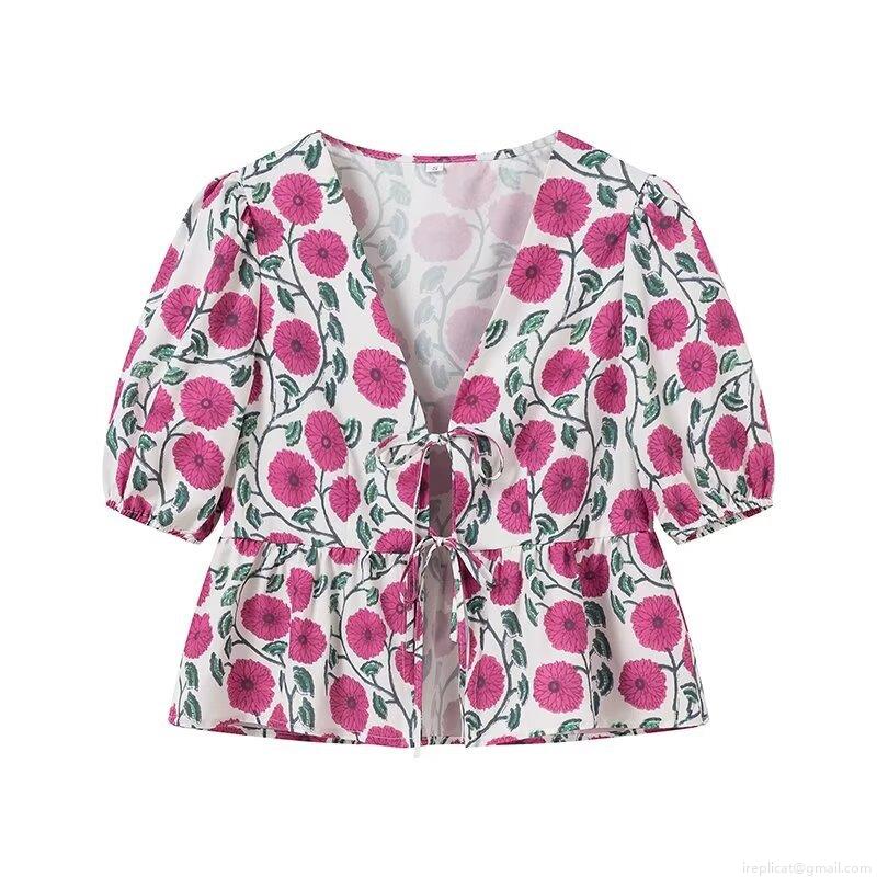 • Women's Summer Short Sleeve V Neck Tie Front Blouse Top Puff Sleeve Peplum Floral Printed Polyester Woven Shirt Casual French Style Elegant Streetwear For Women
