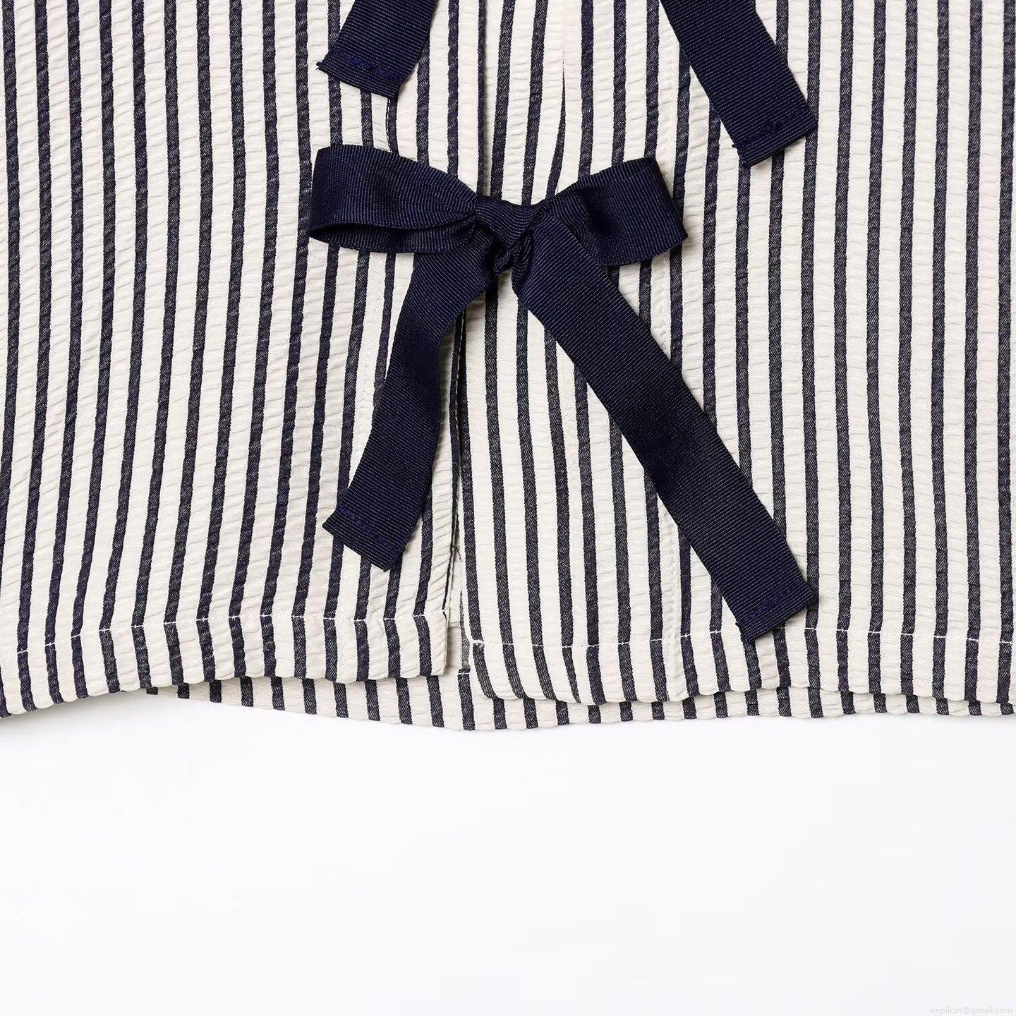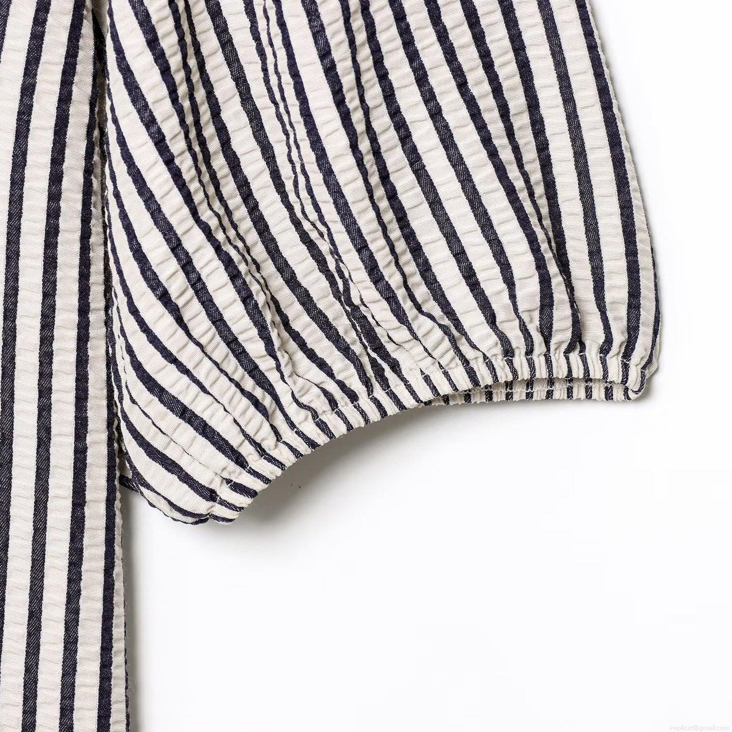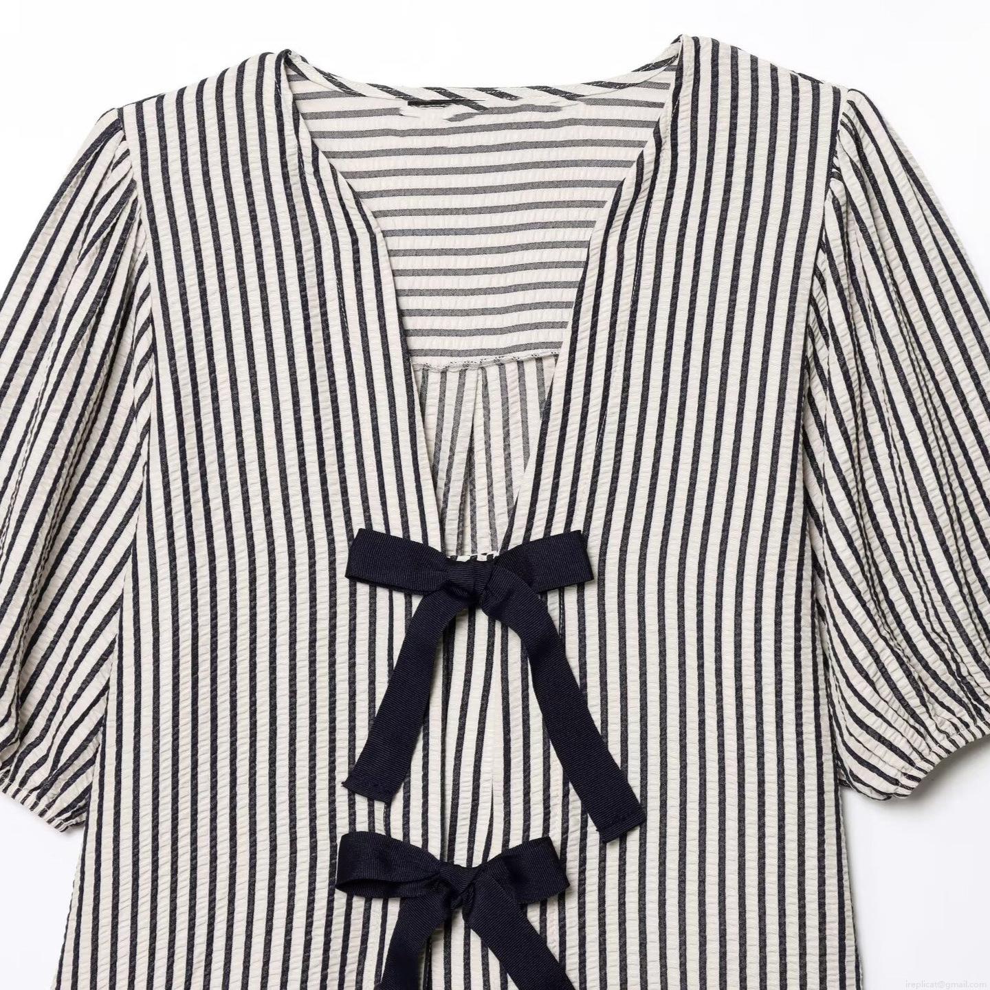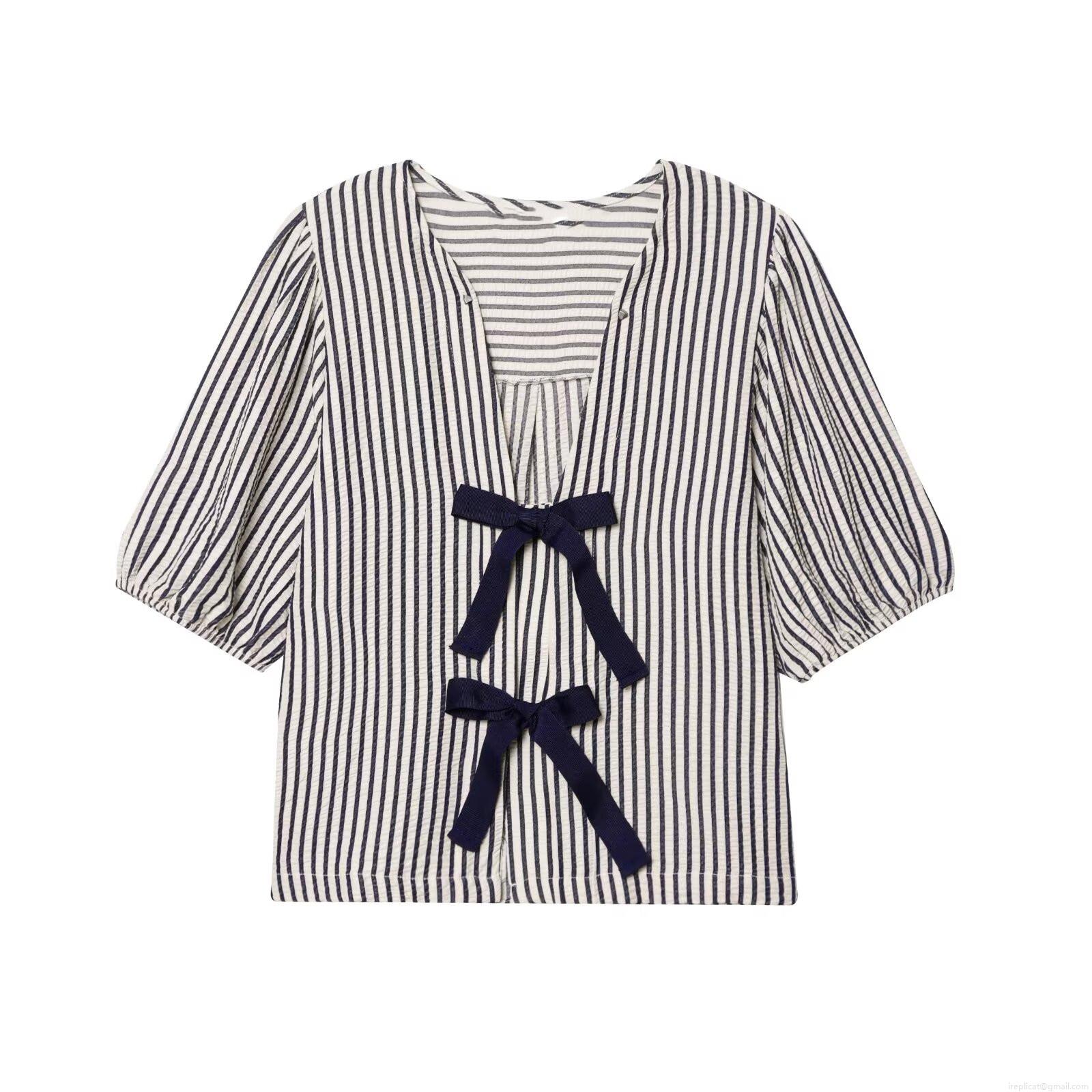 • Women's Summer Striped Seersucker Blouse V Neck Bow Tie Front Puff Sleeve Casual Top Loose Fit Pullover Shirt for Daily Wear