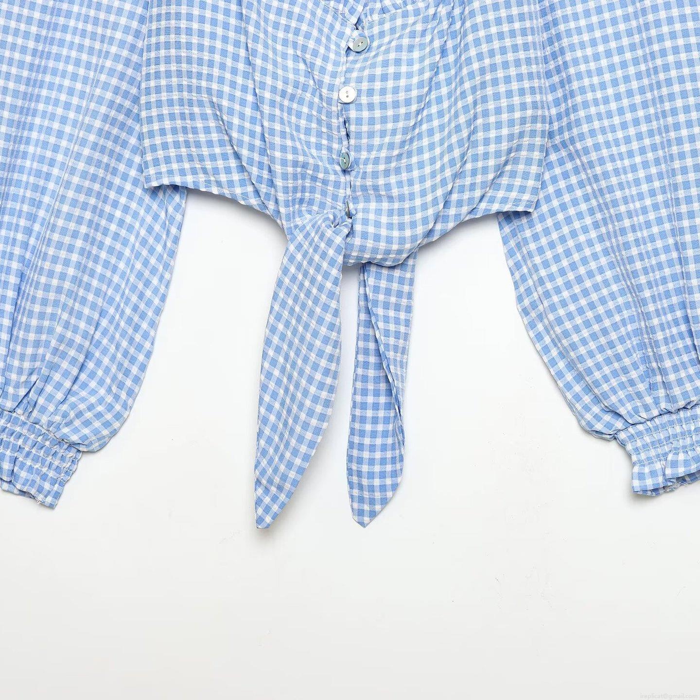 Women's Sweet Gingham Blouse Long Lantern Sleeve Ruffle V-Neck Tie-Up Hem Polyester Button Down Shirt Casual Spring Autumn Top For Women