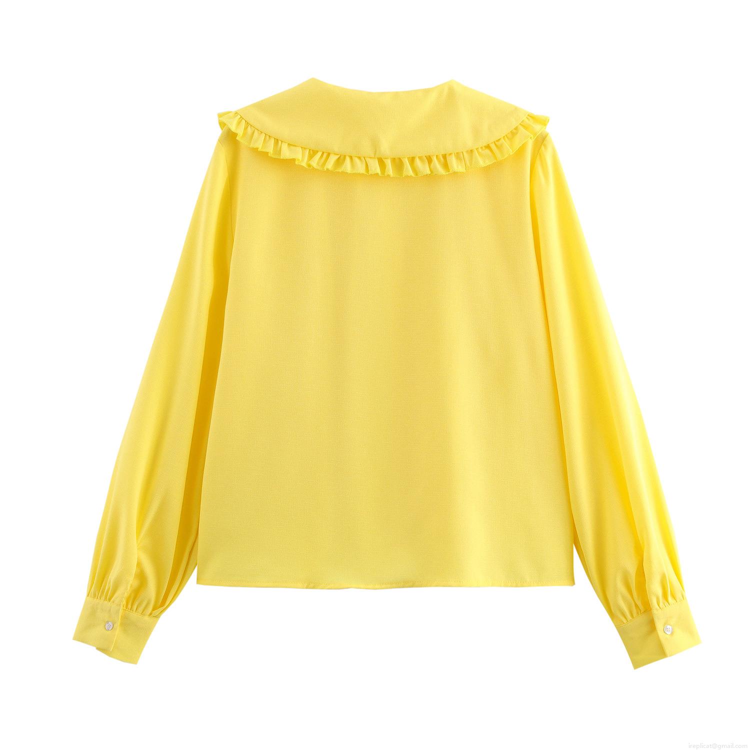 Women's Sweet Peter Pan Collar Ruffle Blouse Solid Color Long Sleeve Button Down Loose Polyester Shirt Spring Autumn Fashion Tops