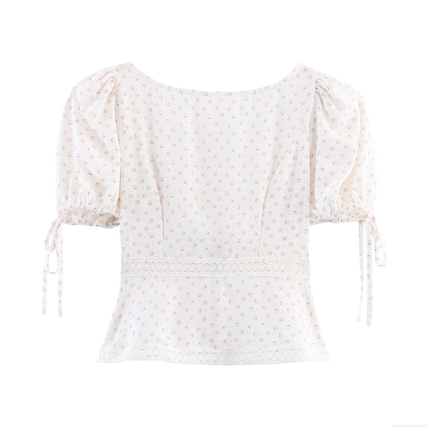 • Women's Sweet Pink Floral Short Sleeve Blouse Square Neck Puff Sleeve Top With Lace Splicing And Tie-Up Detail Elegant Summer Fresh Girly Shirt For Women