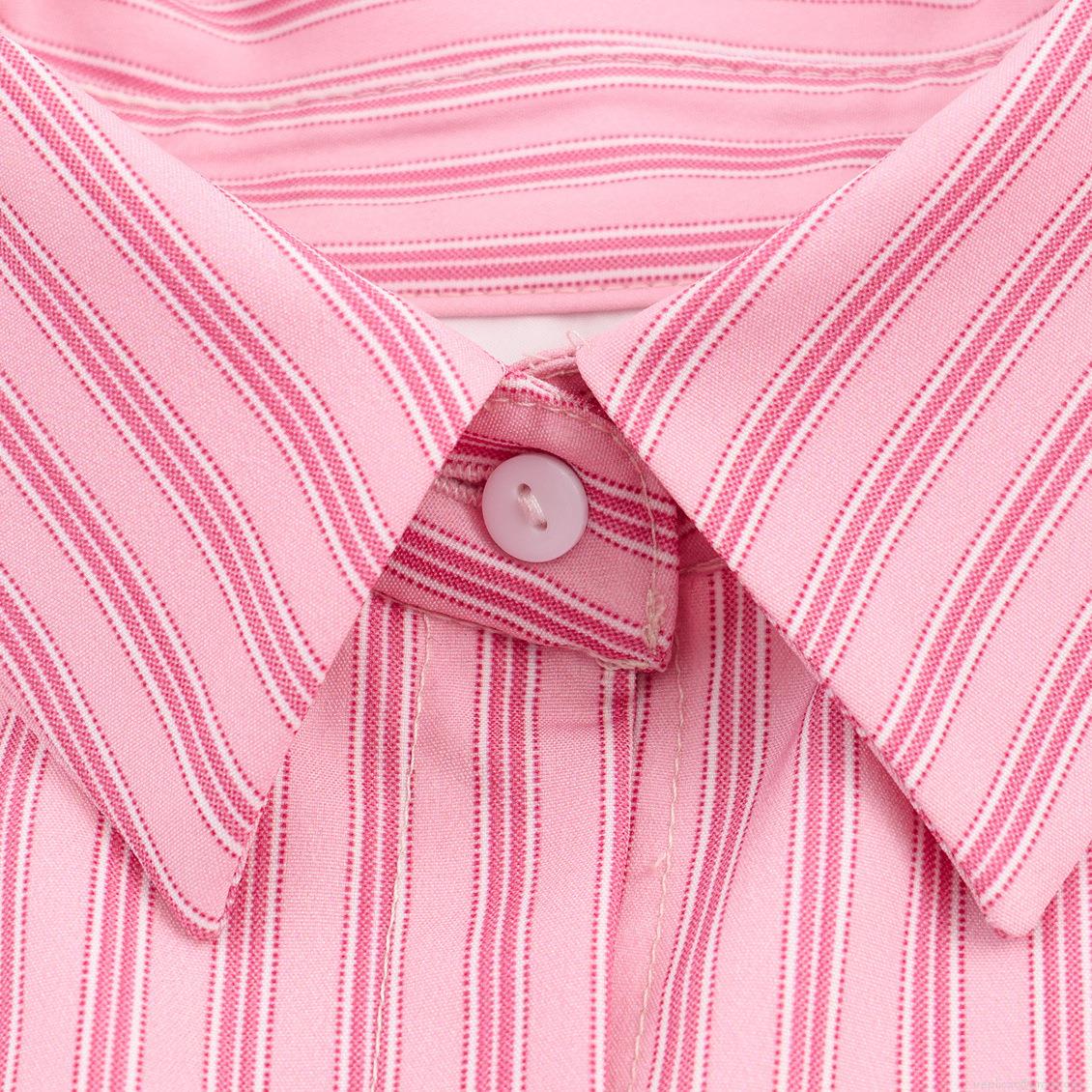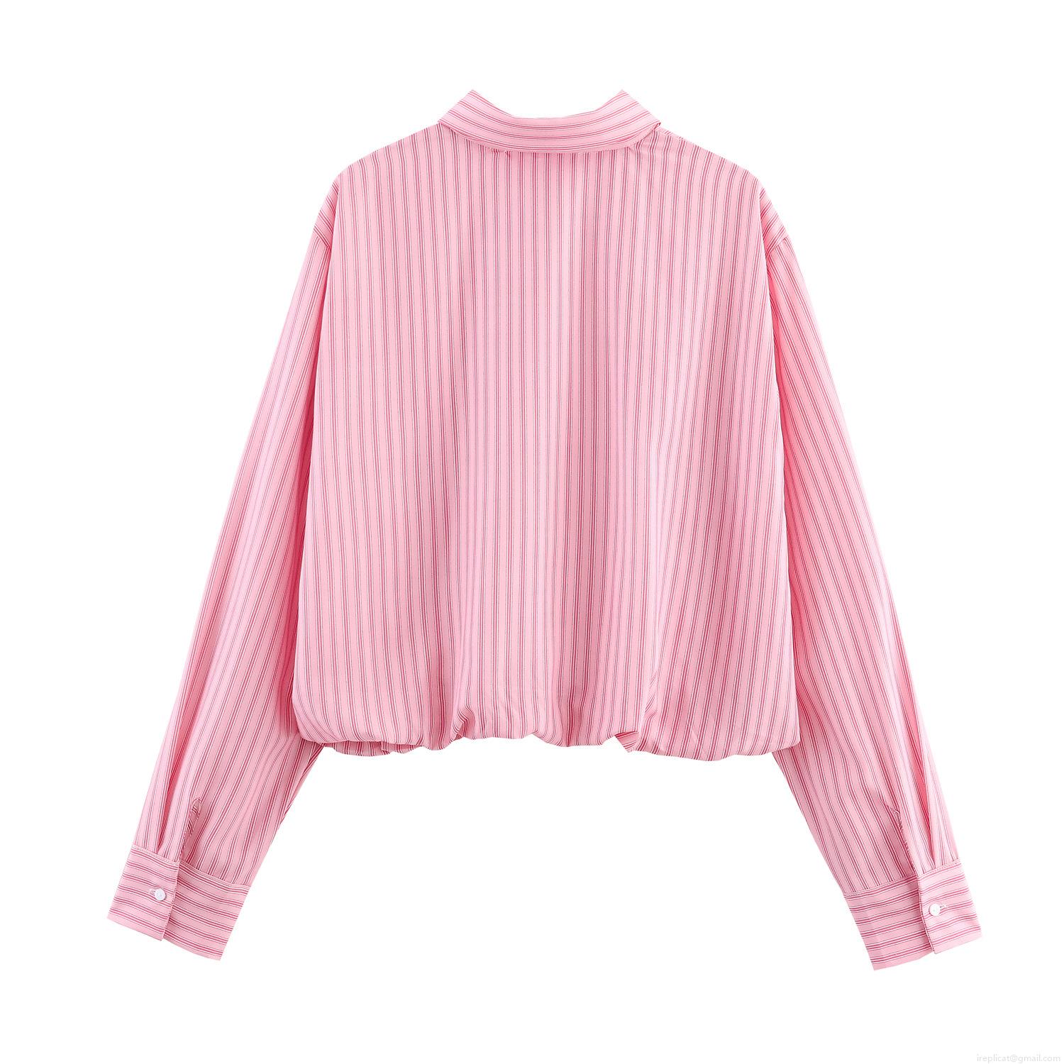 • Women's Sweet Pink White Striped Long Sleeve Blouse Fashion Lapel Single Breasted Shirt With Elastic Hem Puff Sleeve Style Casual Top For Daily Wear