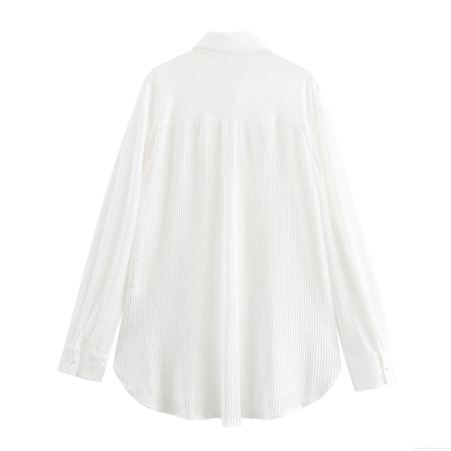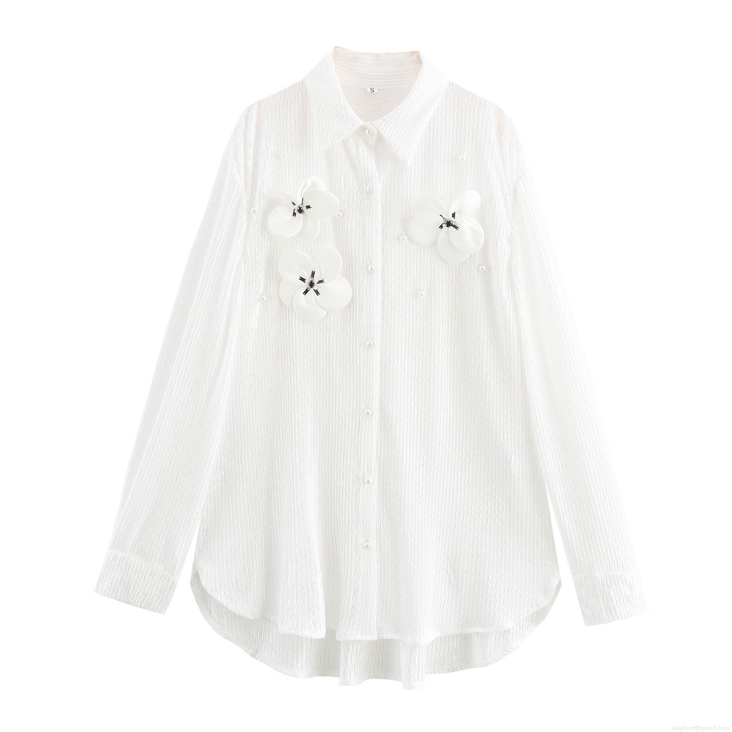 • Women's Textured White Blouse 3D Fabric Flower Decoration Pearl Button Lapel Shirt Casual Vacation Puff Sleeve Top