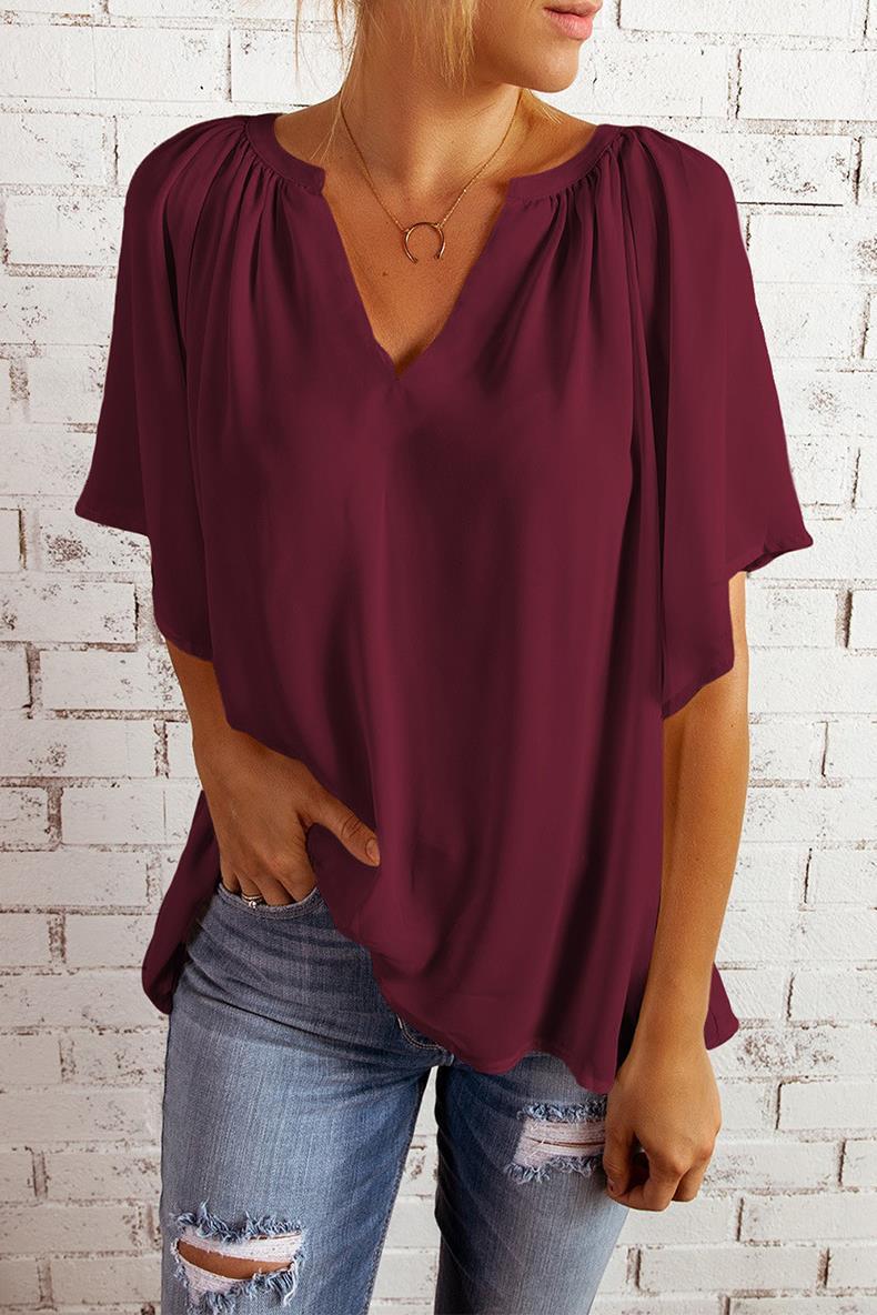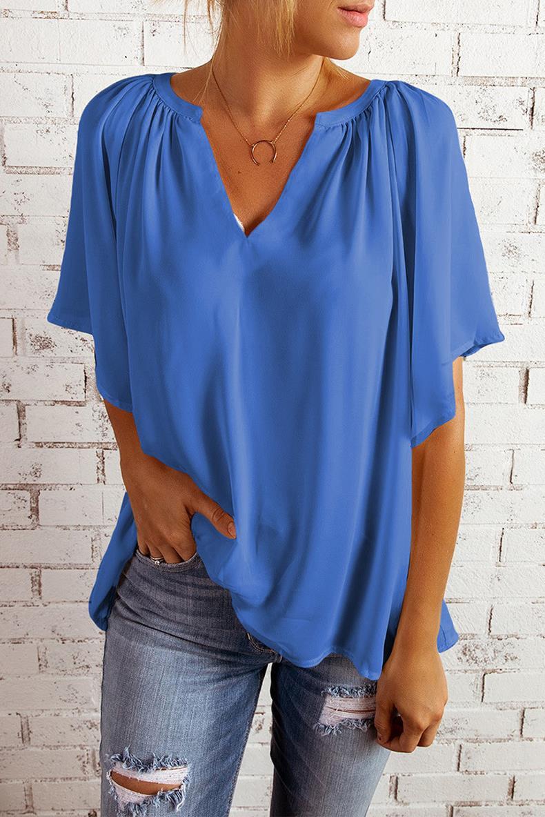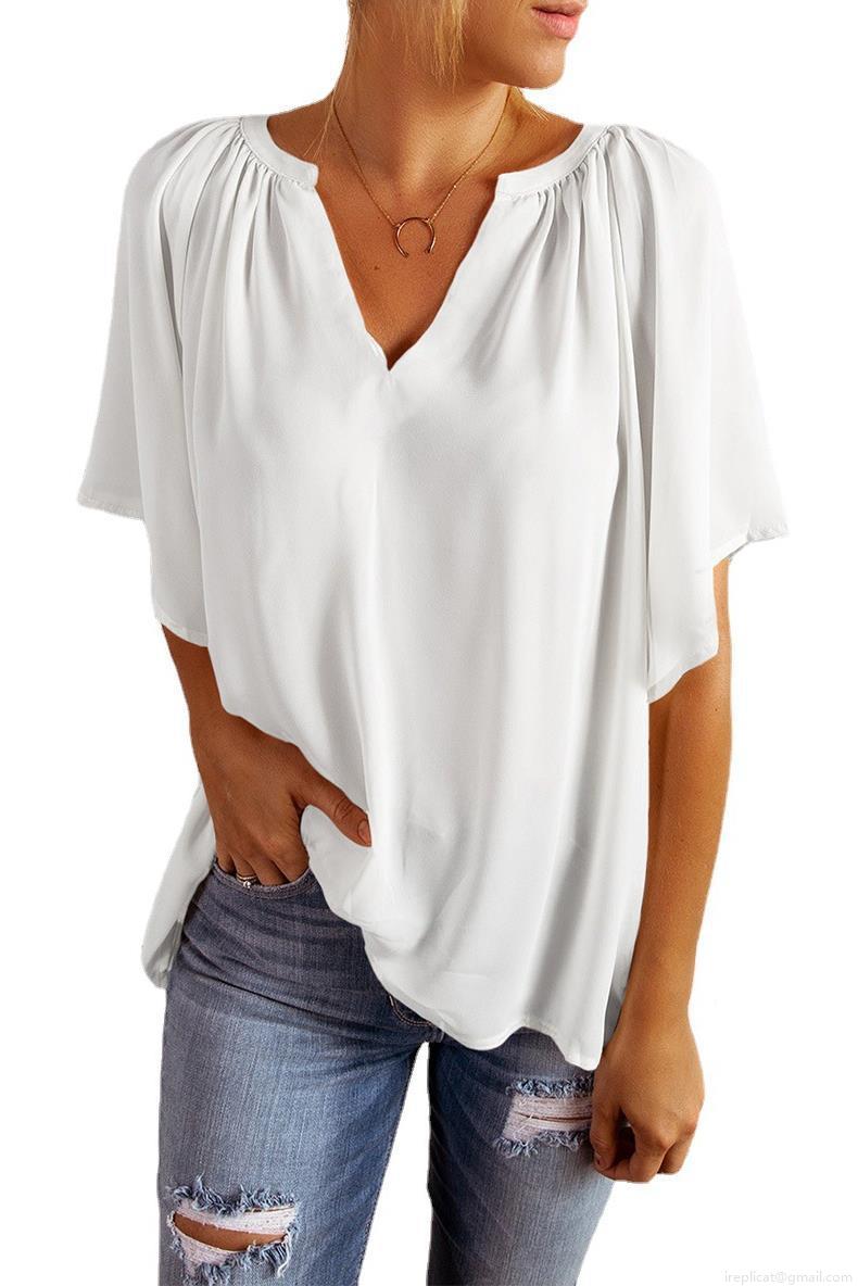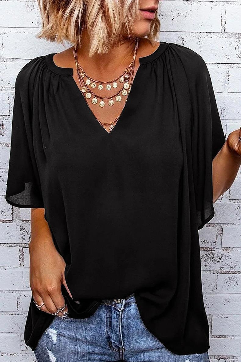 • Women's V Neck Chiffon Blouse Loose Short Sleeve Pleated Summer Top Elegant Commuting Solid Color Casual Pullover Shirt For Women
