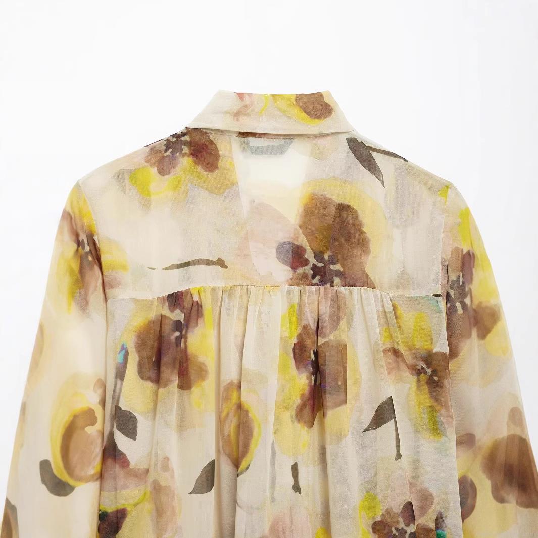 • Women's V Neck Floral Print Chiffon Blouse Long Sleeve Casual Loose Pleated Shirt For Daily Streetwear Yellow Polyester Fashion Tops
