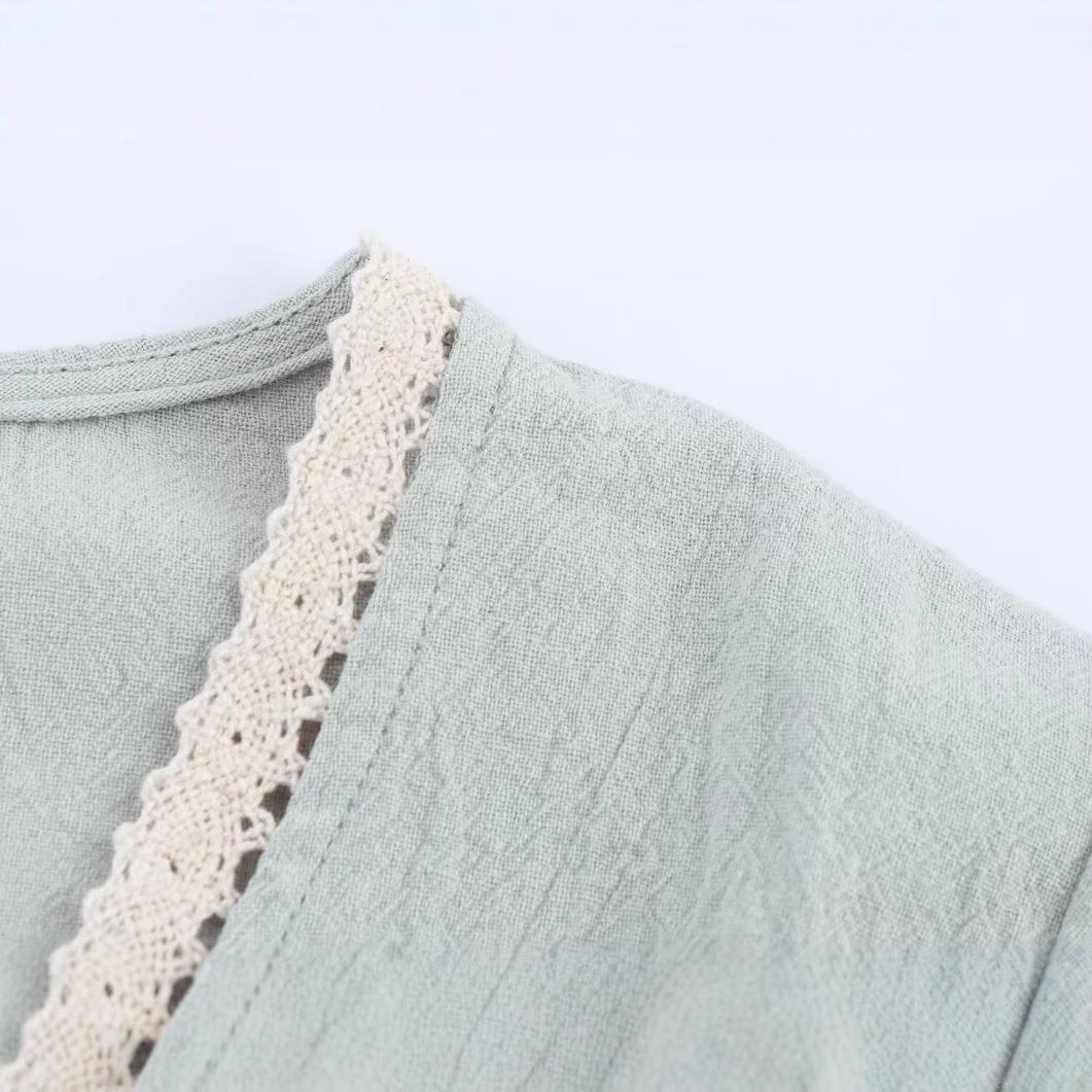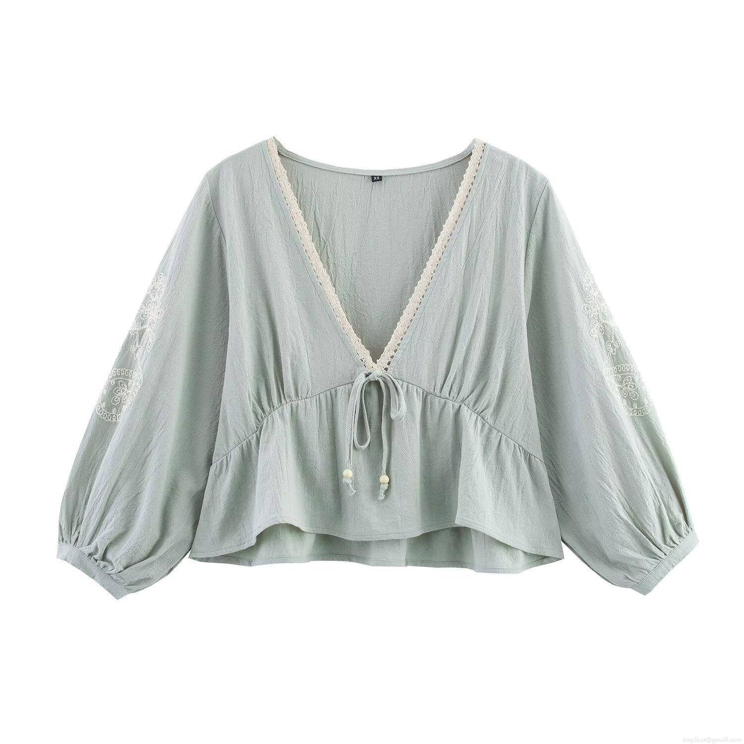 • Women's V Neck Lantern Sleeve Embroidery Blouse Cotton Blend Tie Front Lace Trim Ruffle Hem Casual Shirt Summer Streetwear Tops