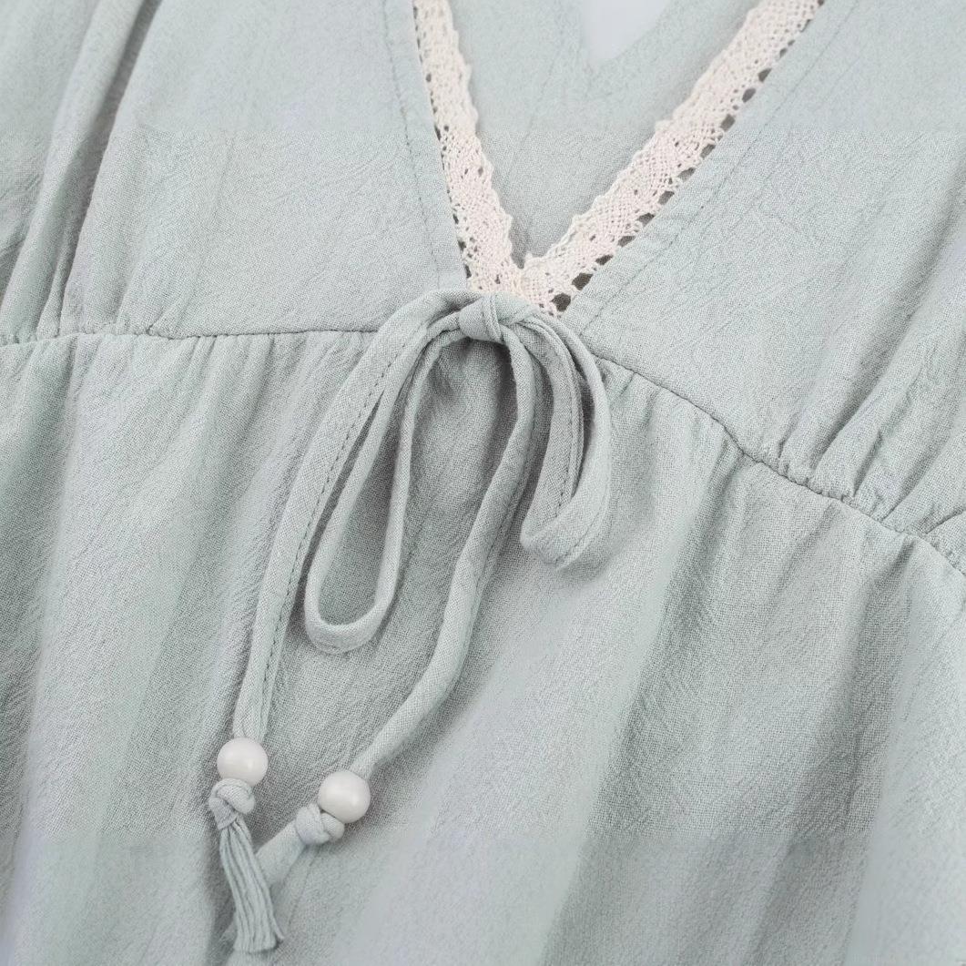 Women's V Neck Lantern Sleeve Embroidery Blouse Cotton Blend Tie Front Lace Trim Ruffle Hem Casual Shirt Summer Streetwear Tops