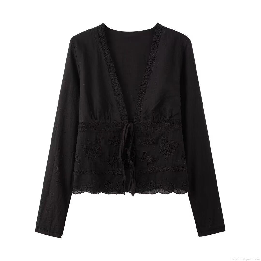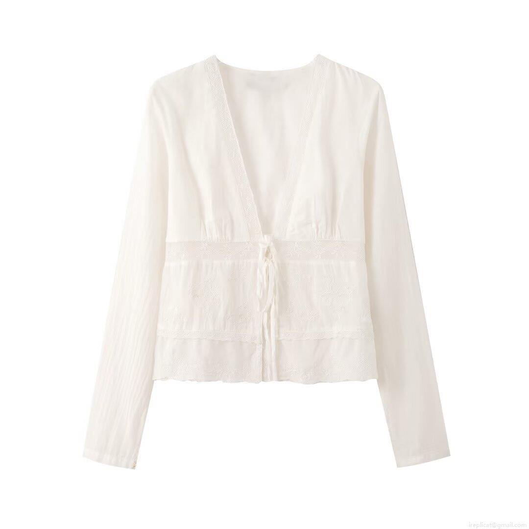 Women's V Neck Long Sleeve Lace Patchwork Blouse Elegant Embroidery Lace Up Shirts Casual Loose Tops For Ladies Streetwear Autumn Fashion