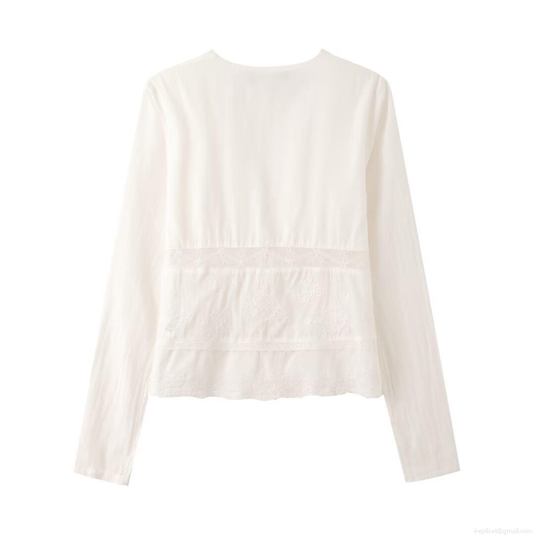 • Women's V Neck Long Sleeve Lace Patchwork Blouse Elegant Embroidery Lace Up Shirts Casual Loose Tops For Ladies Streetwear Autumn Fashion