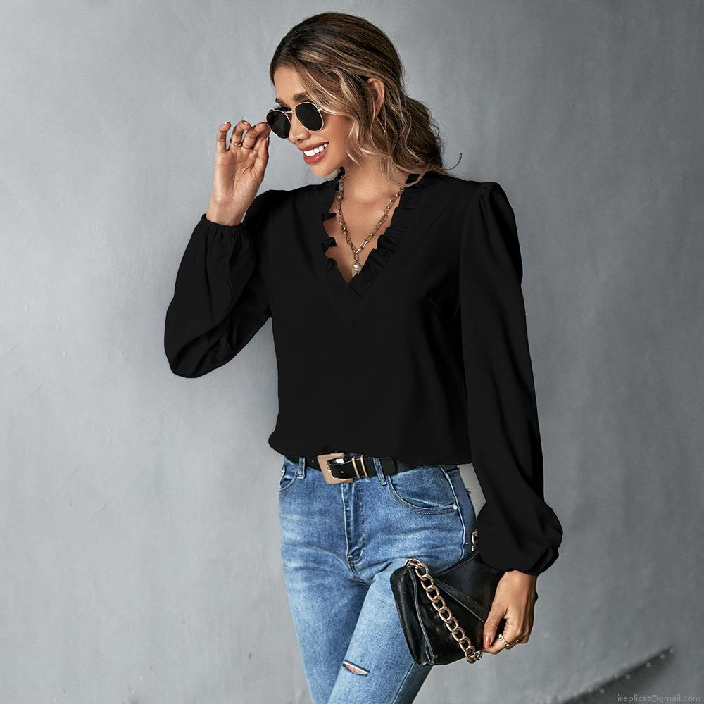 • Women's V Neck Ruffle Long Sleeve Blouse Elegant Polyester Spandex Puff Sleeve Loose Casual Top For Office Daily Wear Solid Color Chic Work Shirt