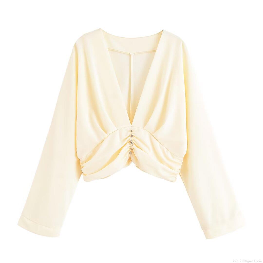 • Women's V Neck Single Breasted Ruched Cropped Blouse Long Sleeve Polyester Slim Fit Solid Color Autumn Western Street Style Shirt Top
