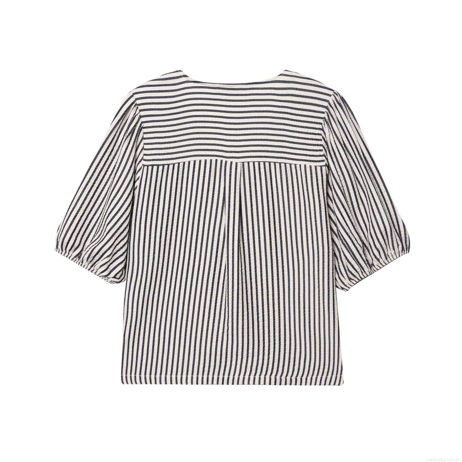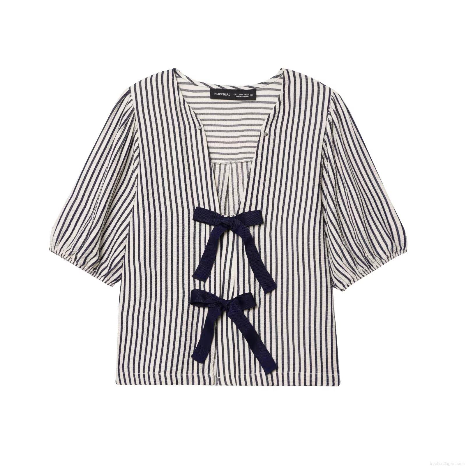 Women's V Neck Striped Blouse Seersucker Puff Sleeve Top With Bow Detail Retro Summer Short Sleeve Shirt Casual Streetwear Navy White