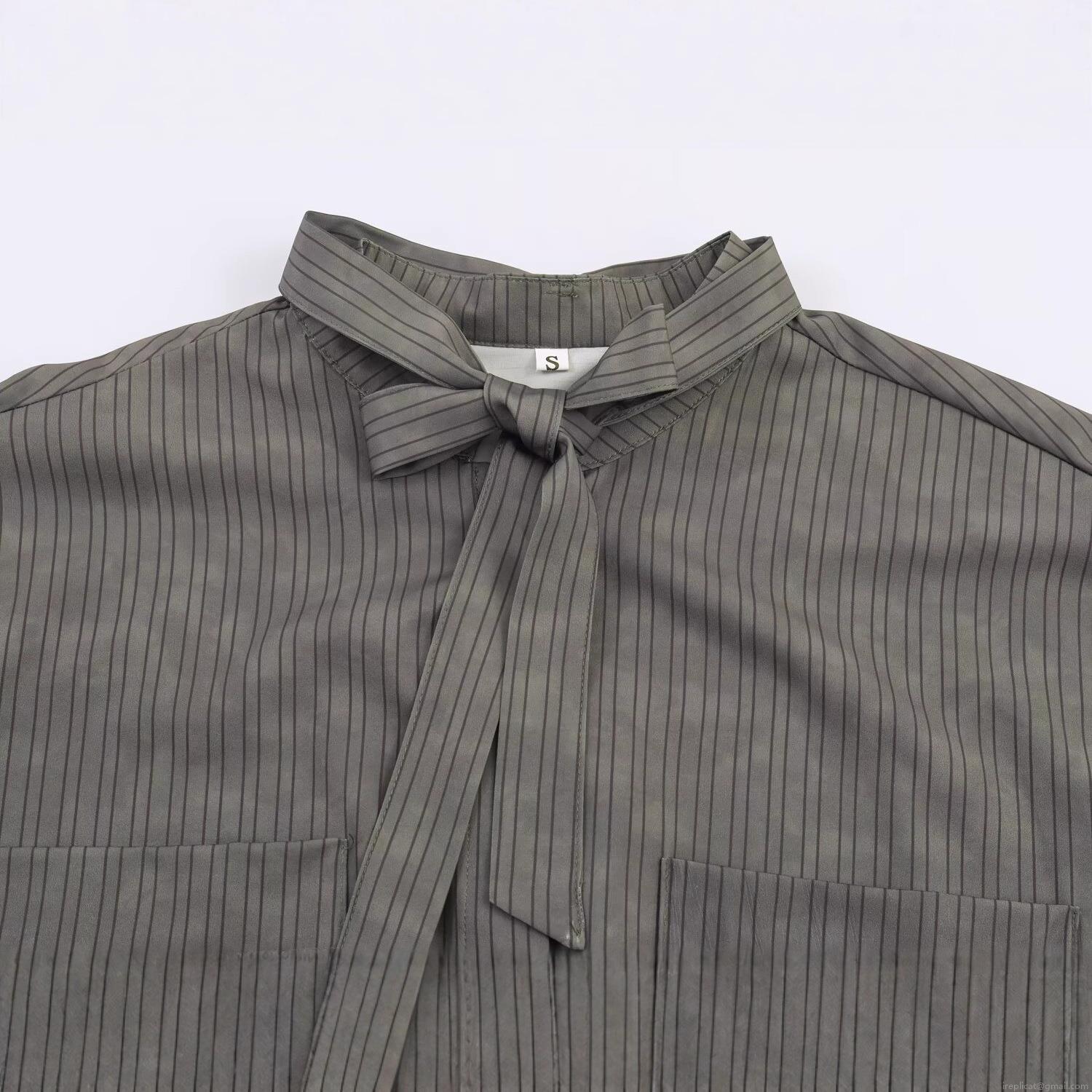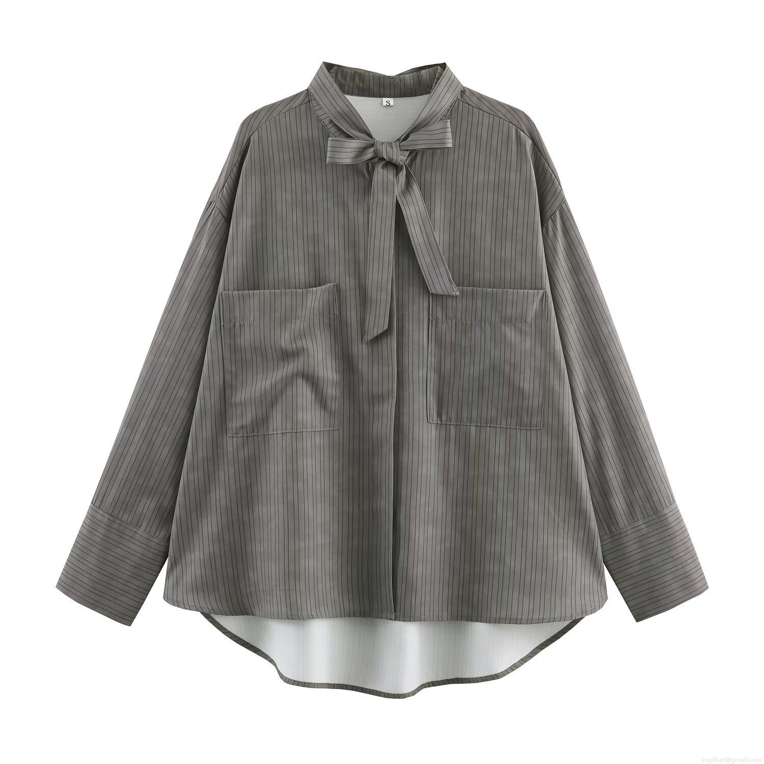 • Women's Vertical Striped Long Sleeve Blouse Bow Tie Neck Woven Shirt With Two Pockets Casual Street Style Tops For Female