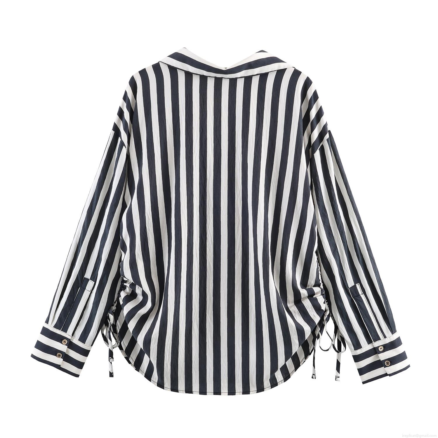 Women's Vertical Striped Shirt Long Sleeve Polyester Button Down Blouse Side Drawstring Ruched Bottom Casual Elegant Office Top for Women