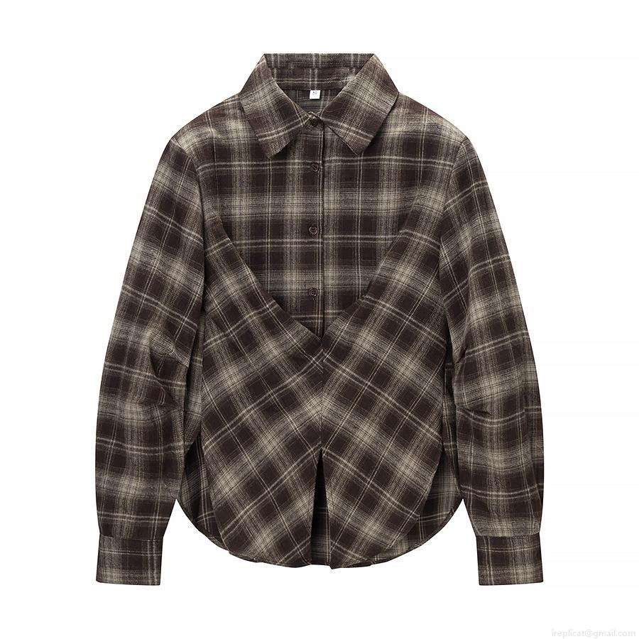 Women's Vintage Brown Plaid Long Sleeve Shirt Waist Narrowing Button Up Flannel Texture Blouse Casual Checkered Top For Ladies