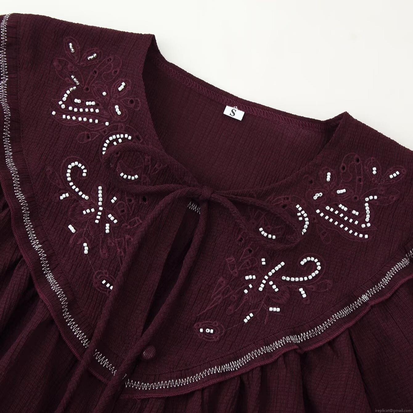 • Women's Vintage Deep Wine Red Blouse With Large Embroidery Beaded Collar Loose Fit Long Sleeve Tie Neck Ruffle Cuff Crinkle Texture Shirt Top