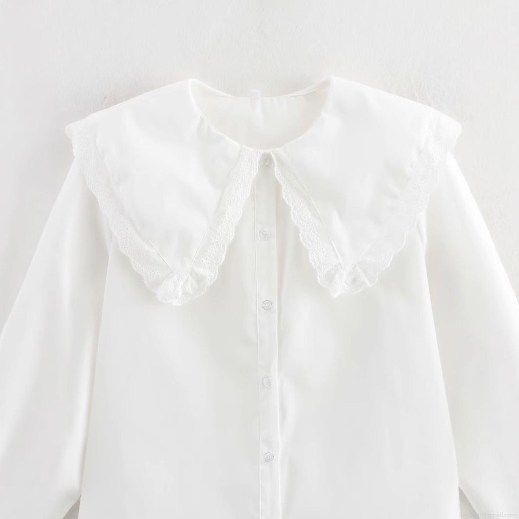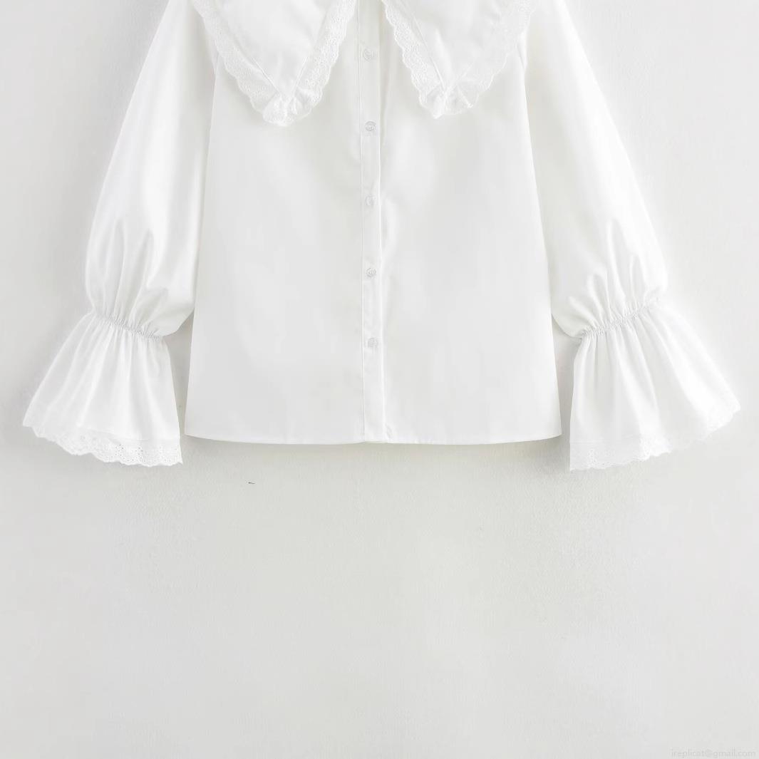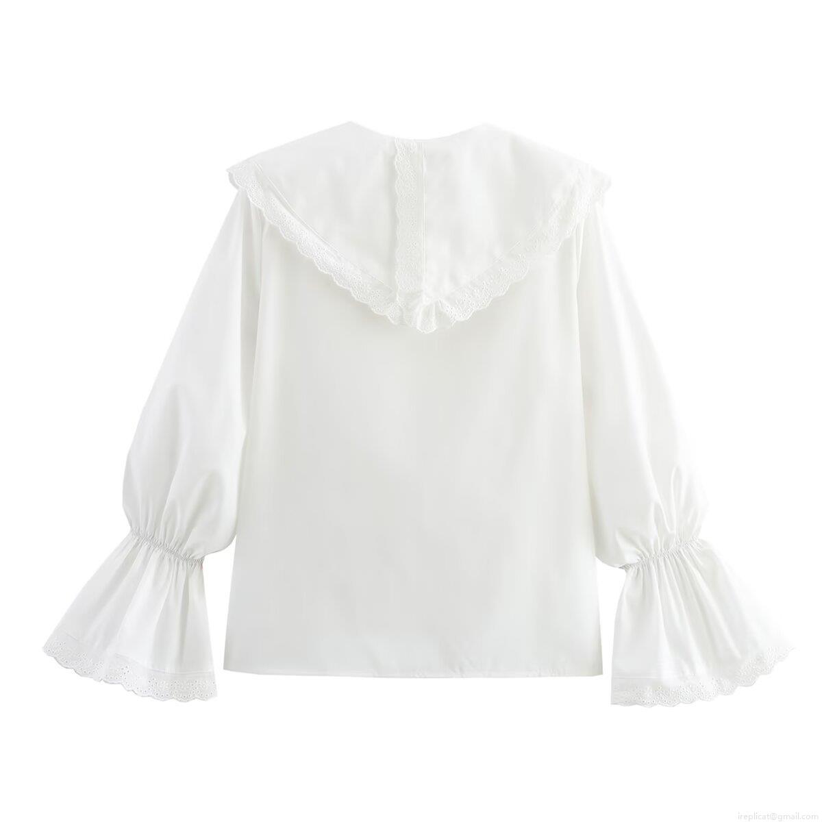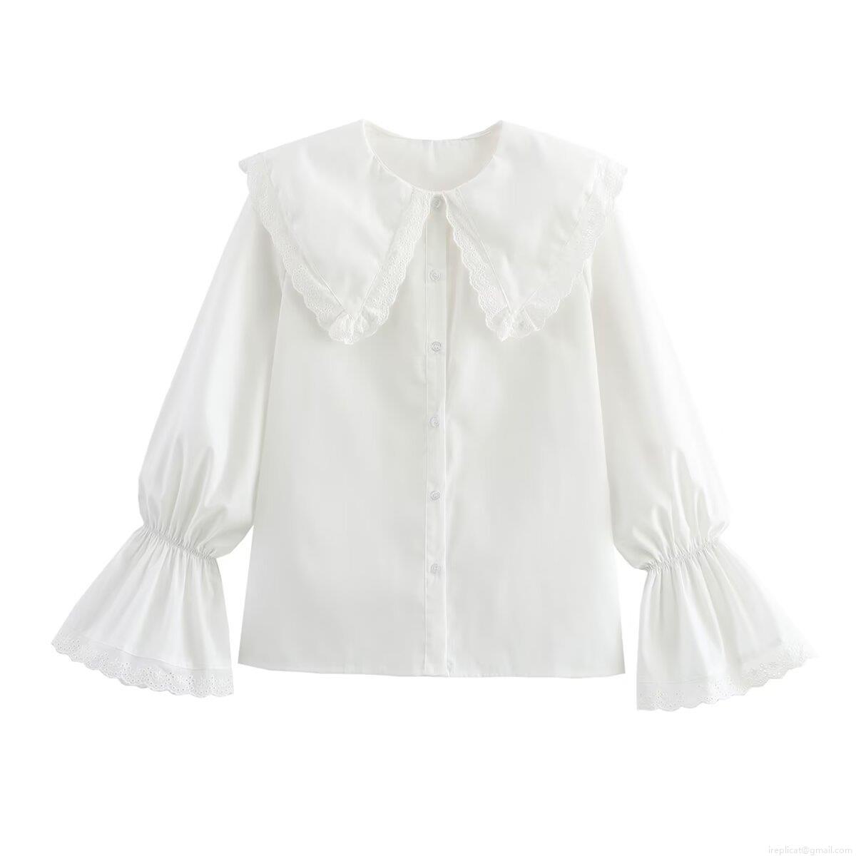 • Women's Vintage Doll Collar Lace Blouse Long Sleeve Button Down Shirt Sweet Off-White Flare Sleeve Casual Tops