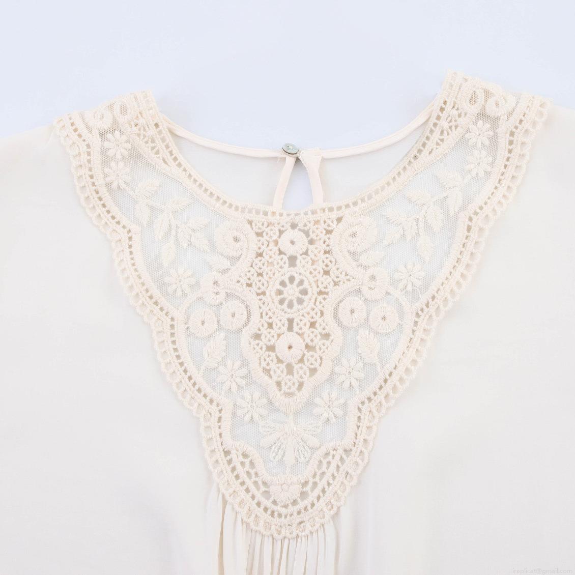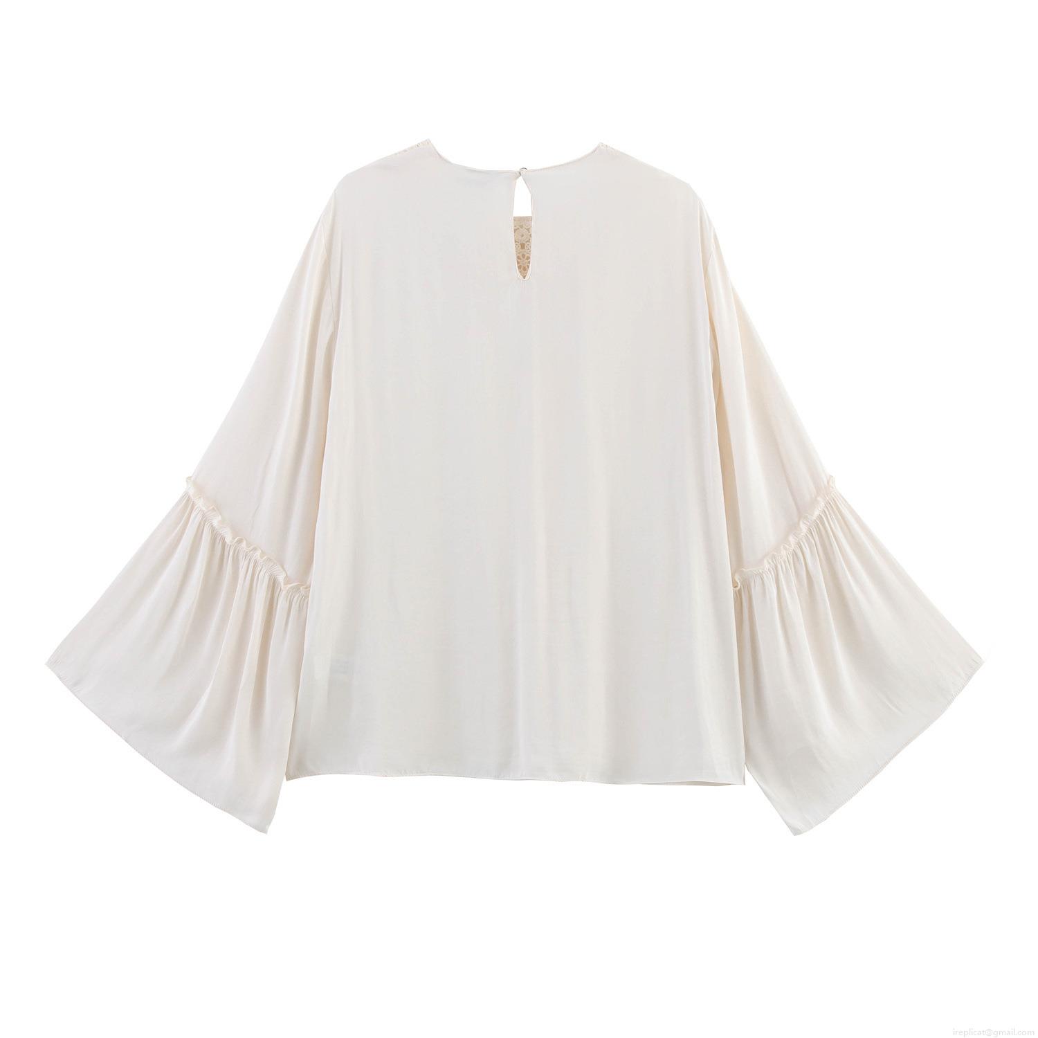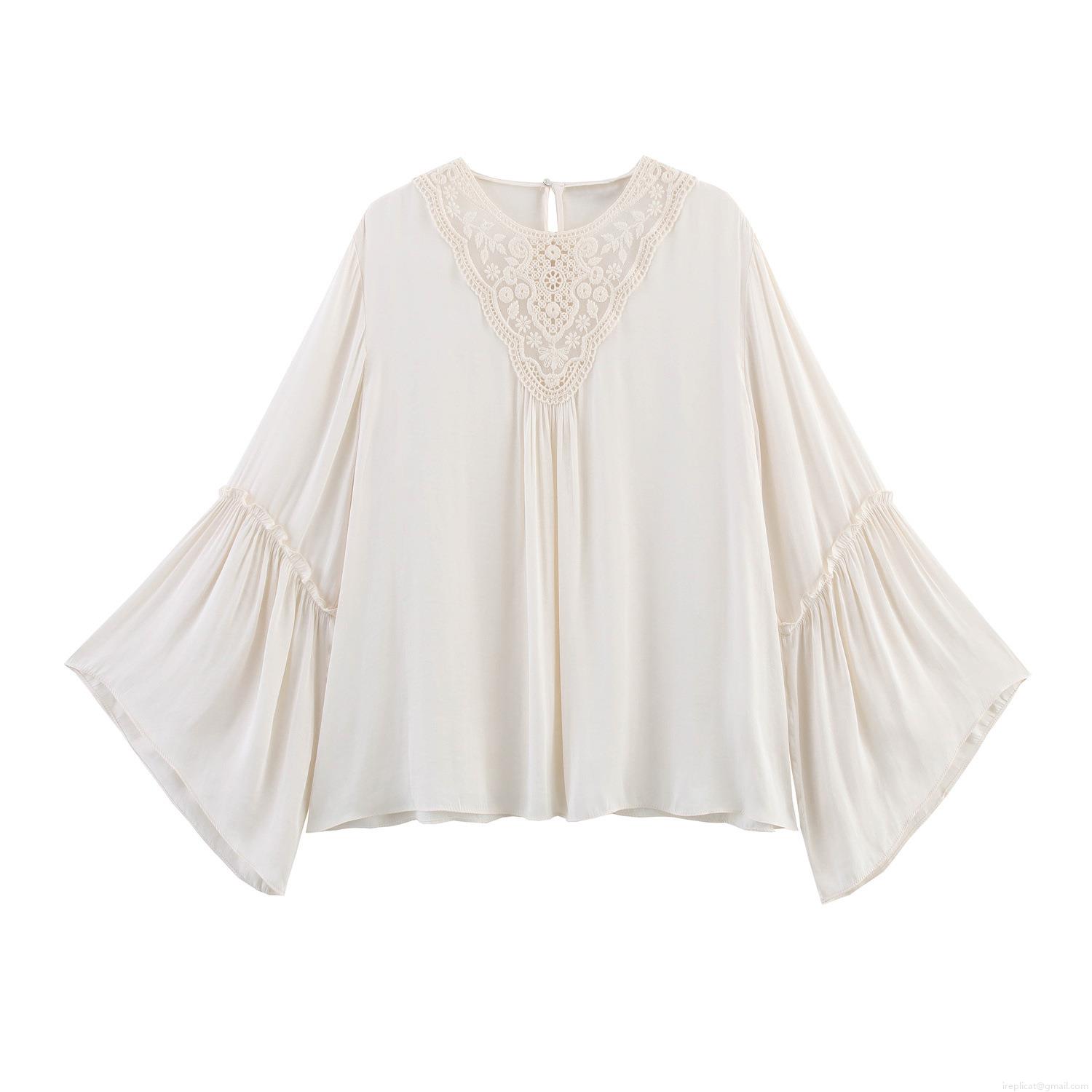 • Women's Vintage Ethnic Embroidery Lace Blouse Elegant Pleated Long Sleeve Ruffle Cuff Solid Off-white Chiffon Shirt Loose Casual Palace Style Top