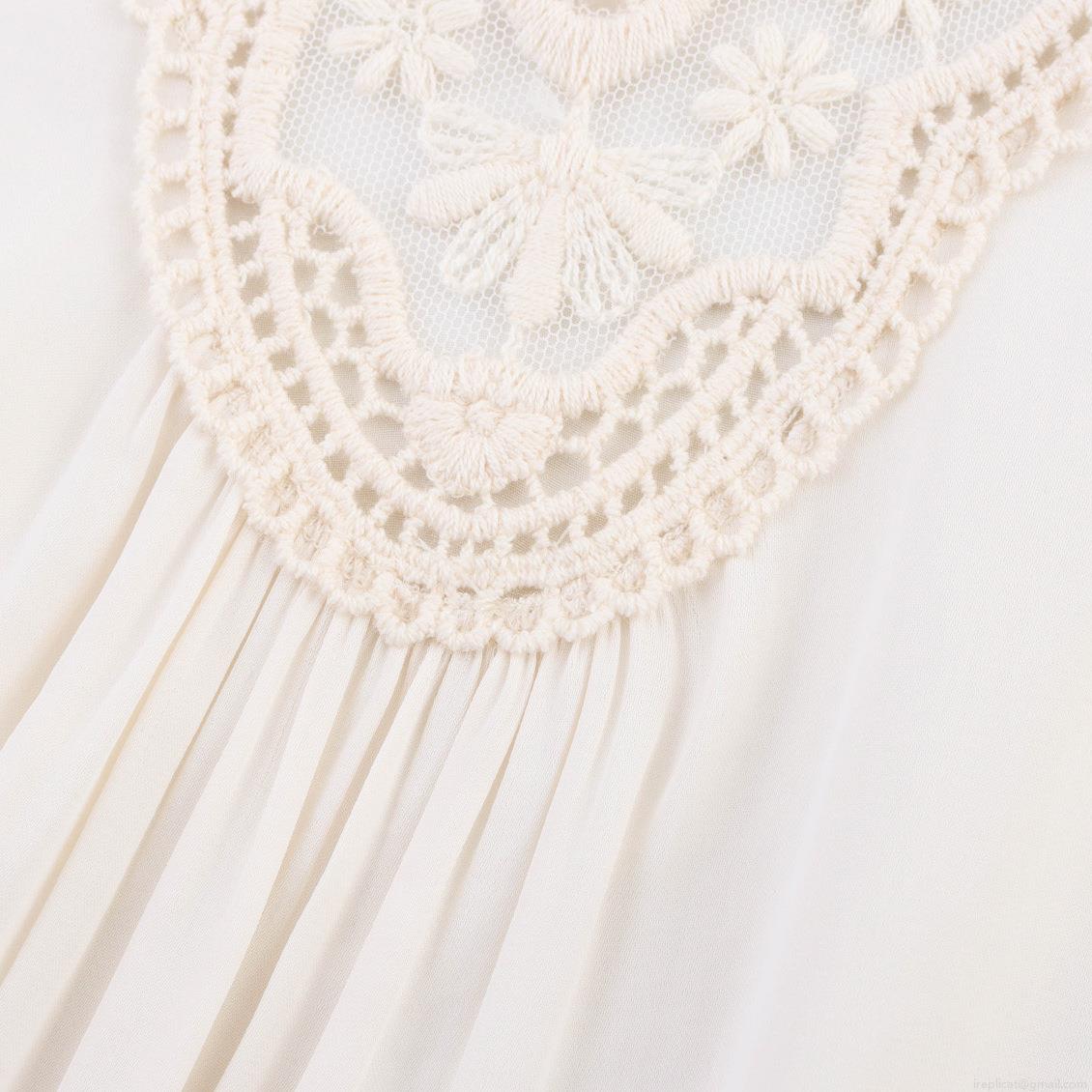 Women's Vintage Ethnic Embroidery Lace Blouse Elegant Pleated Long Sleeve Ruffle Cuff Solid Off-white Chiffon Shirt Loose Casual Palace Style Top