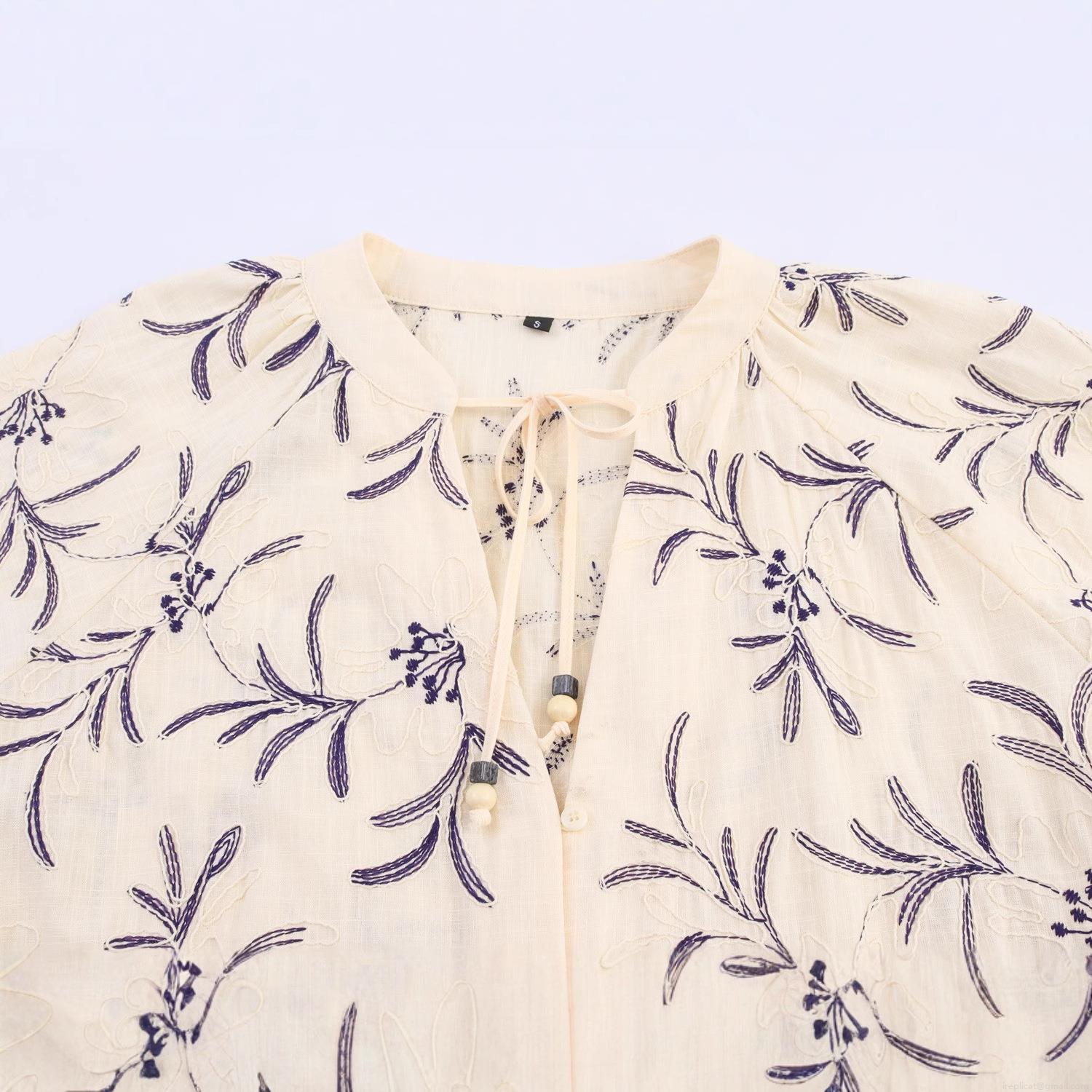• Women's Vintage Floral Embroidered Blouse 85% Cotton Blend Lantern Sleeve Shirt Bohemian Casual Round Neck Long Sleeve Top For Daily Fashion