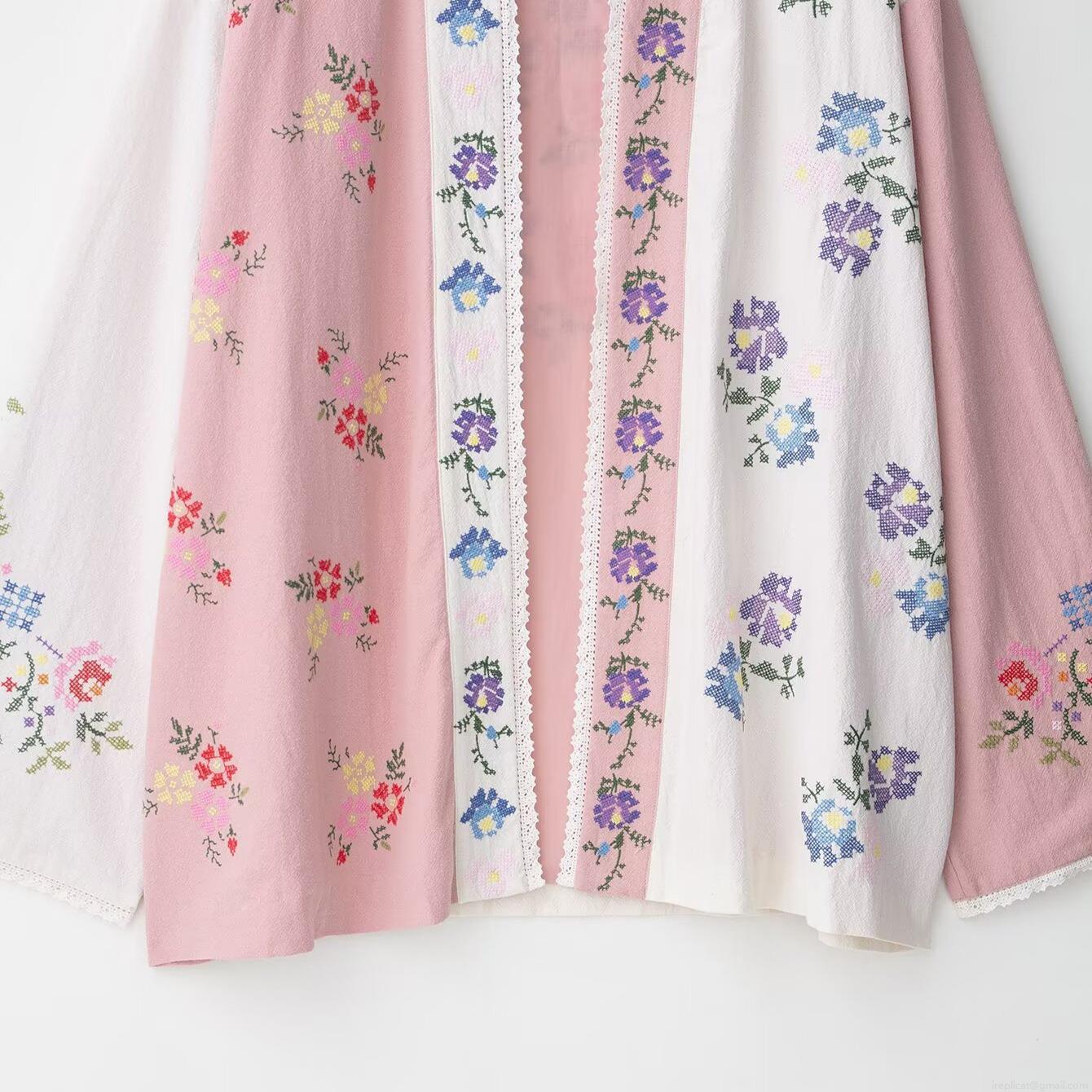 • Women's Vintage Floral Embroidery Cardigan Pink White Patchwork V-Neck Long Sleeve Blouse Casual Lace Trim Open Front Shirt Summer Light Jacket Top for Women
