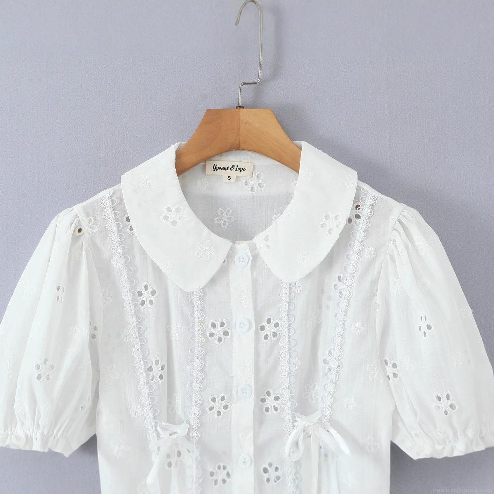 Women's Vintage Hollow Embroidery Puff Sleeve Blouse Peter Pan Collar Lace-up White Cotton Top Sweet Street Style Summer Short Shirt