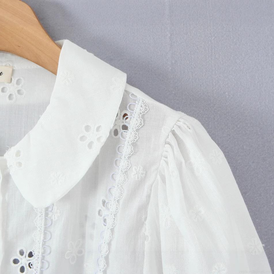 • Women's Vintage Hollow Embroidery Puff Sleeve Blouse Peter Pan Collar Lace-up White Cotton Top Sweet Street Style Summer Short Shirt