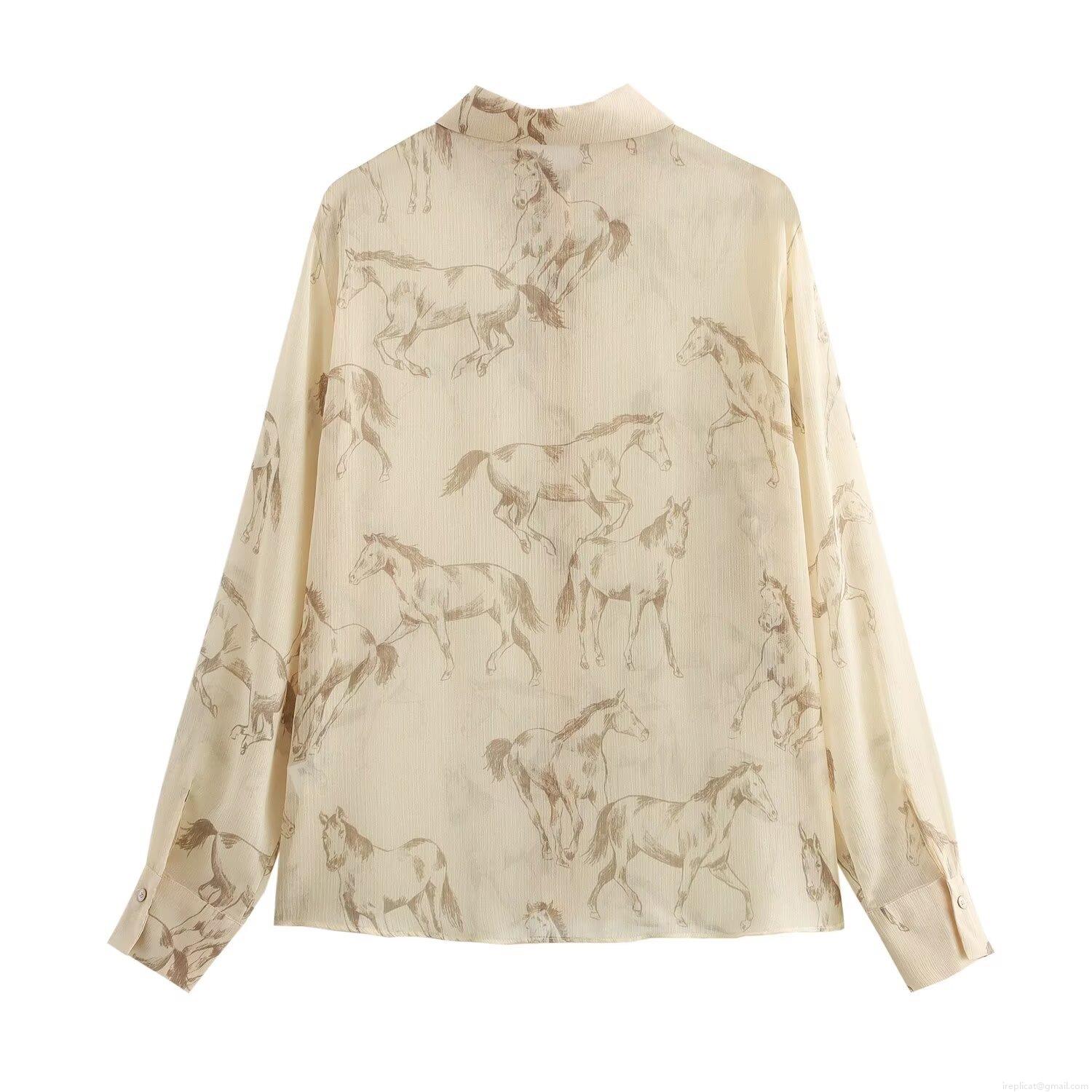 • Women's Vintage Horse Print Long Sleeve Chiffon Blouse Shirt With Metal Tip Collar Loose Fit Beige Button Down Casual Tops For Women Streetwear