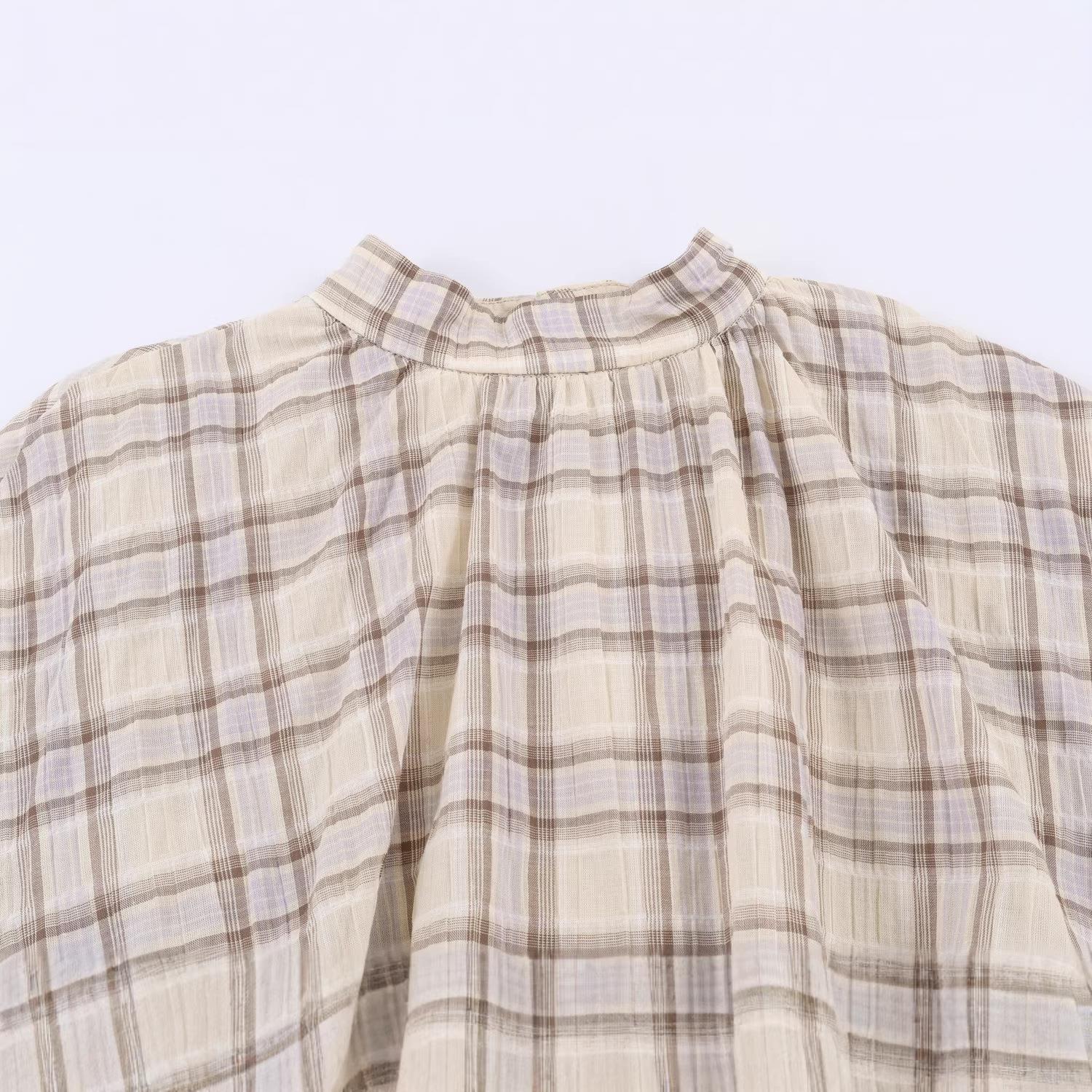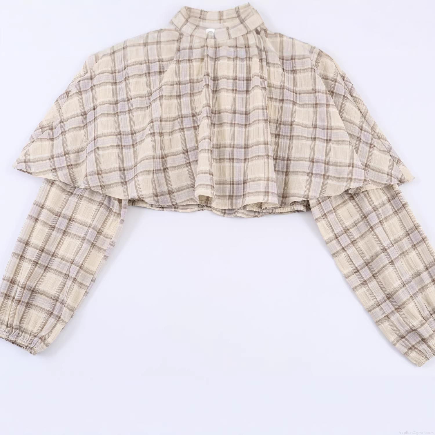 • Women's Vintage Plaid Ruffle Mock Neck Long Sleeve Top Layered Cape Design Cropped Blouse For Spring Autumn Elegant Ladies Fashion